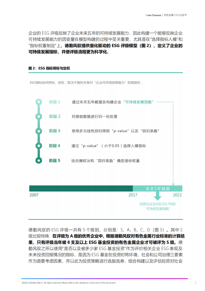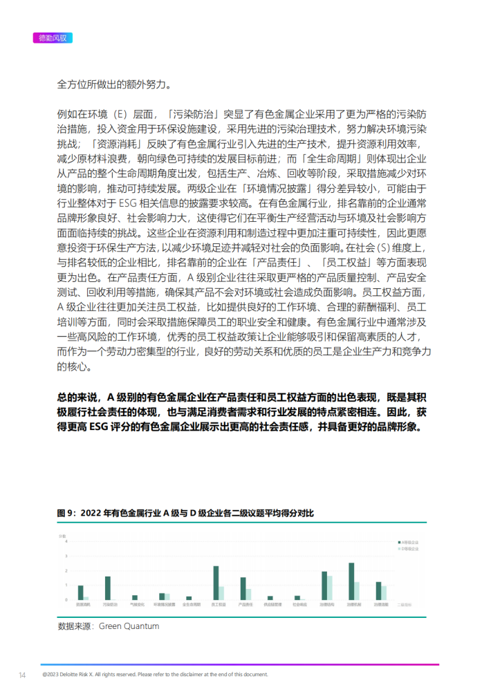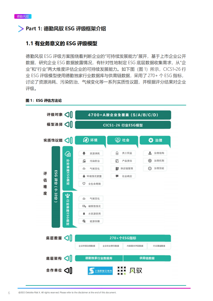 ESG(Environmental,Social and Governance),即环境、社会与公司治理,是衡量一家公司社会责任感的重要指标,评价企业在环境、社会和治理绩效方面的表现。始于2005年时任联合国秘书长安南牵头推出全球经济研究报告《在乎者赢》,ESG已从一个先锋理念逐渐转换为极具必要性和实际意义的投资风向标,成为各国主流投资机构投资实践中的重要考量因素。自2020年我国提出“碳达峰、碳中和“目标以来,国内投资机构也紧跟国际主流,将环境、社会和公司治理绩效纳入投资指标考量。因此,于企业而言,提升ESG表现不是额外成本支出,而是提升盈利能力和可持续发展能力的重要举措;于金融机构而言,发展ESG评级的目的不是为了在业务中筛选掉低评级的公司,而是为了更好地帮助低评级公司成长,促进企业及全社会的可持续发展。在国内双碳行动势在必行、国外负责任投资风头正盛的当下,对ESG的深度解读已成为企业可持续发展、投资者成功投资的必经之路。根据德勤风驭自2020年起开展的全A股上市公司ESG评级数据,2022年全A股2700+家上市公司中,共有400+家上市公司ESG评级在A级(含)以上,占比9.1%。因此,国内企业的ESG表现提升任重而道远。
