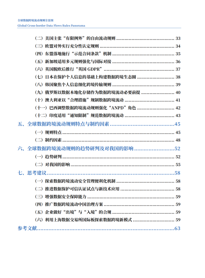 研究发现,在国际组织层面,主要国际组织在全球层面推动数据跨境流动“软法”的构建,典型的如联合国(UN)建立数据跨境流动国际合作平台,经合组织(OECD)首创有关数据跨境流动与个人数据和隐私保护的基本原则,世界贸易组织(WTO)在电子商务谈判中推动数据跨境流动议题讨论等。在区域及双边框架层面,主要经济体通过加入或缔结区域或双边自贸协定及数字经济专项协定,如《美墨加协定》(USMCA)、《全面与进步跨太平洋伙伴关系协定》(CPTPP)、《区域全面经济伙伴关系协定》(RCEP)、《数字经济伙伴关系协定》(DEPA)等,将数据跨境流动相关条款纳入相关协定中,旨在破除各国间数据跨境流动壁垒,促进全球数据自由流动。在主要经济体层面,包括中国、美国、欧盟、英国、韩国、印度、巴西、俄罗斯、澳大利亚、新加坡、日本等,出于维护自身数据安全的必要,纷纷进行立法规制,明确数据出境安全前提。