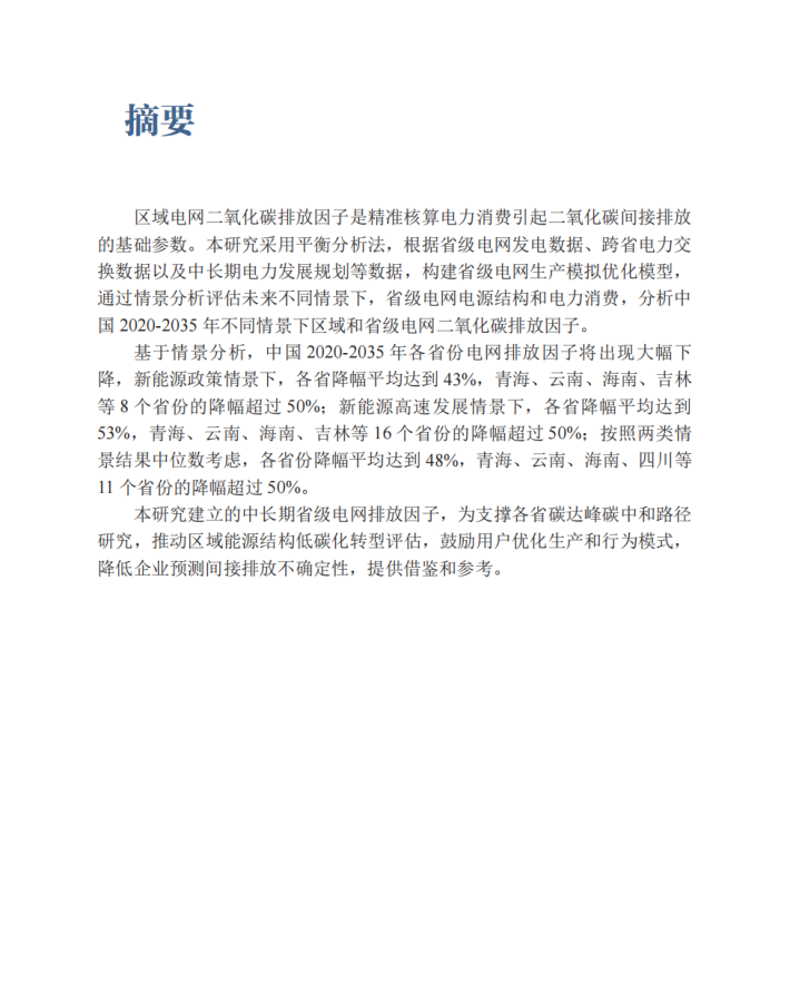 基于情景分析,中国2020-2035年各省份电网排放因子将出现大幅下降,新能源政策情景下,各省降幅平均达到43%,青海、云南、海南、吉林等8个省份的降幅超过50%;新能源高速发展情景下,各省降幅平均达到53%,青海、云南、海南、吉林等16个省份的降幅超过50%;按照两类情景结果中位数考虑,各省份降幅平均达到48%,青海、云南、海南、四川等11个省份的降幅超过50%。