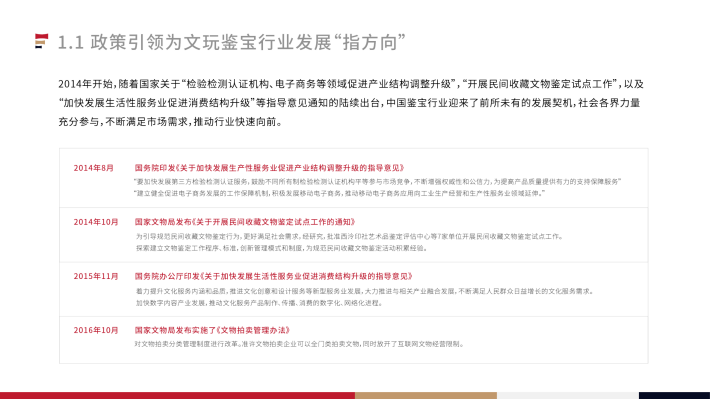 2014年开始,随着国家关于“检验检测认证机构、电子商务等领域促进产业结构调整升级”,“开展民间收藏文物鉴定试点工作”,以及“加快发展生活性服务业促进消费结构升级”等指导意见通知的陆续出台,中国鉴宝行业迎来了前所未有的发展契机,社会各界力量充分参与,不断满足市场需求,推动行业快速向前。
