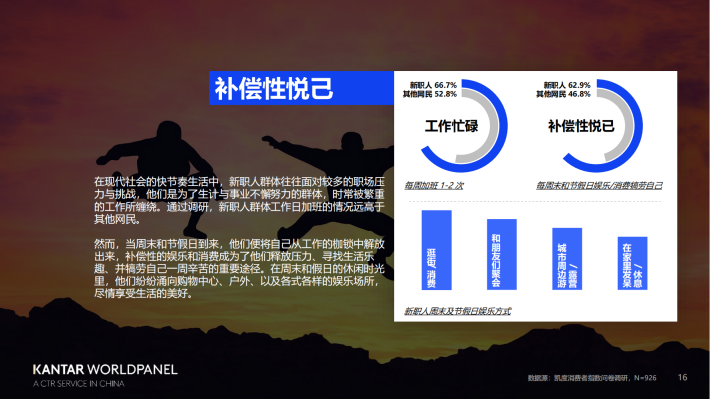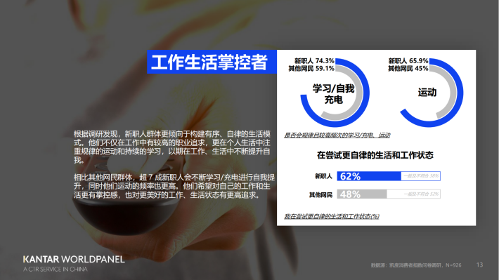 相比其他网民群体,超7成新职人会不断学习/充电进行自我提升,同时他们运动的频率也更高。他们希望对自己的工作和生活更有掌控感,也对更美好的工作、生活状态有更高追求。