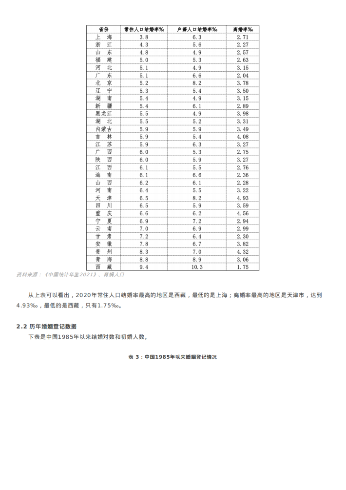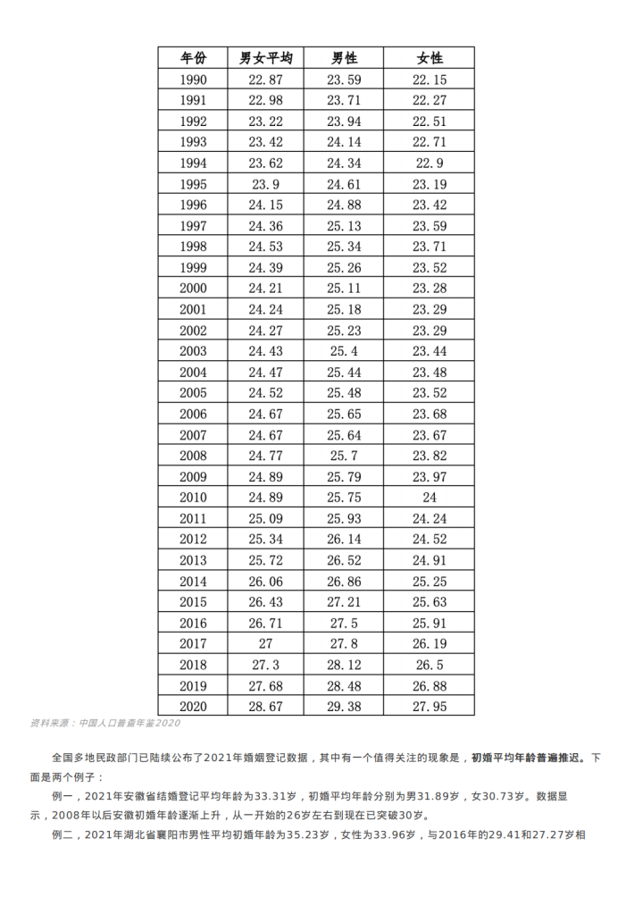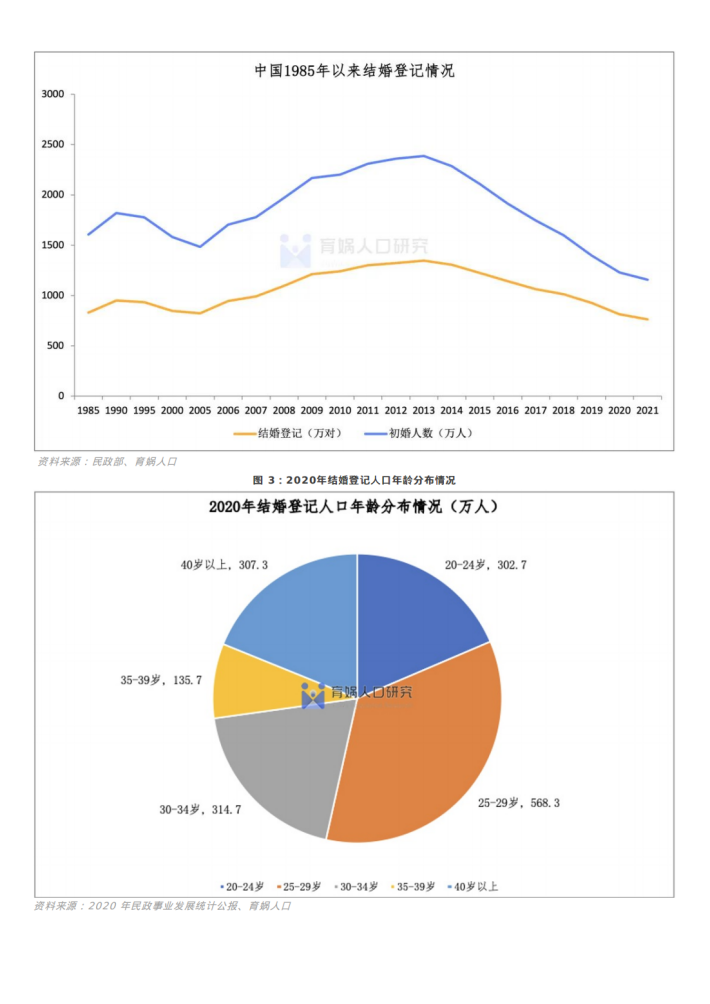 根据《中国统计年鉴2021》的数据,按每五岁分组的人口数来看,2020年30-34岁人口有12415万人,25-29岁人口有9185万人,20-24岁人口有7494万人。由于步入婚龄人口数量呈不断下降趋势,可以预计,未来几年我国的初婚人数仍然会继续下降。