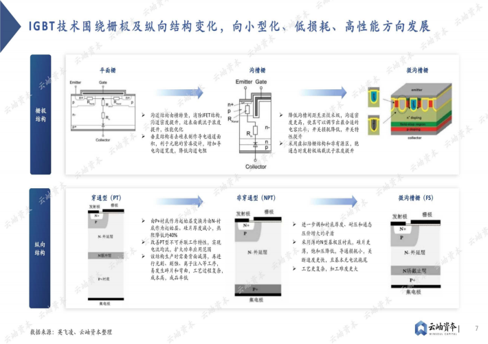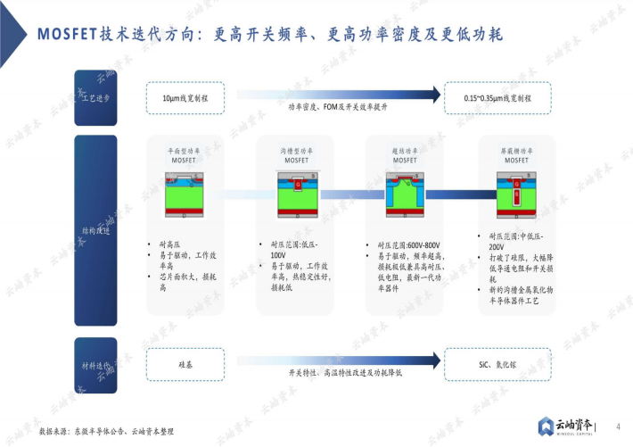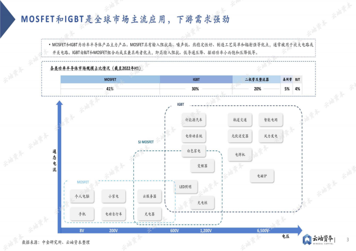 MOSFET和IGBT为功率半导体产品主力产品。MOSFET具有输入阻抗高、噪声低、热稳定性好、制造工艺简单和辐射强等优点,通常被用于放大电路或开关电路。IGBT由BJT和MOSFET组合而成且兼具两者优点,即高输入阻抗、低导通压降、驱动功率小而饱和压降低等。