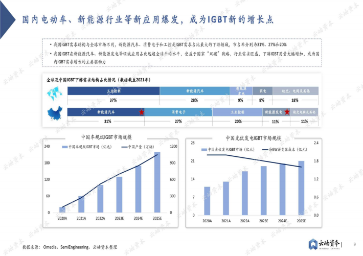 我国IGBT需求结构与全球市场不同,新能源汽车、消费电子和工控是IGBT需求占比最大的下游领域,市占率分别为31%、27%和20%