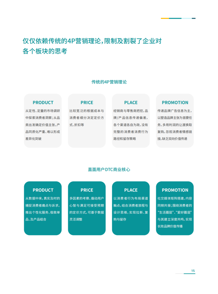 今年,我们立足经典4P营销理论,推出全新的企业营销增长洞见与模型,是将4P营销与直面用户DTC理论进行了完整的融合,我们认为传统的4P模型理论虽是经典、是根基、却不再能简单的支撑企业的长久商业发展,新的直面用户DTC商业理论在4P的基础之上给了企业重新整合组织架构、实战创新运营、实现生意重构的新价值。