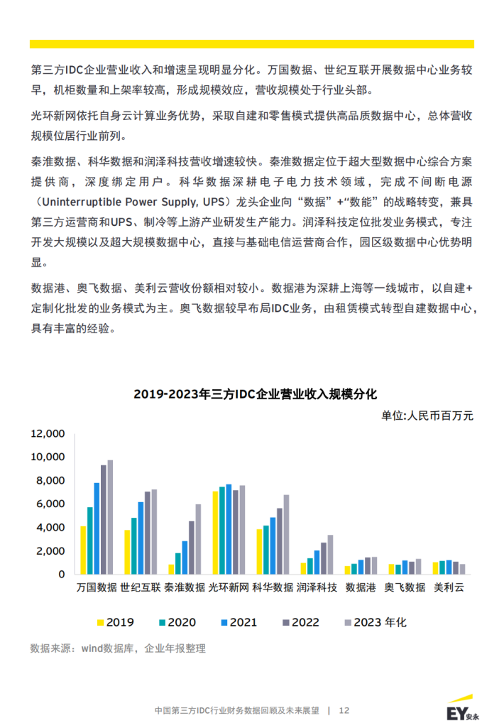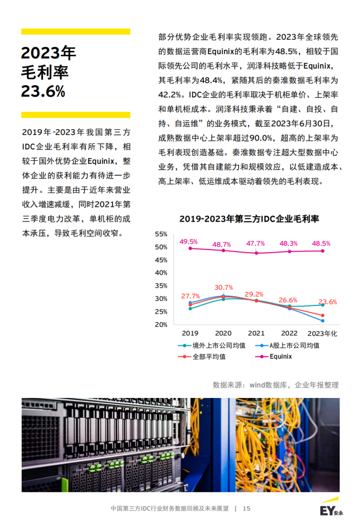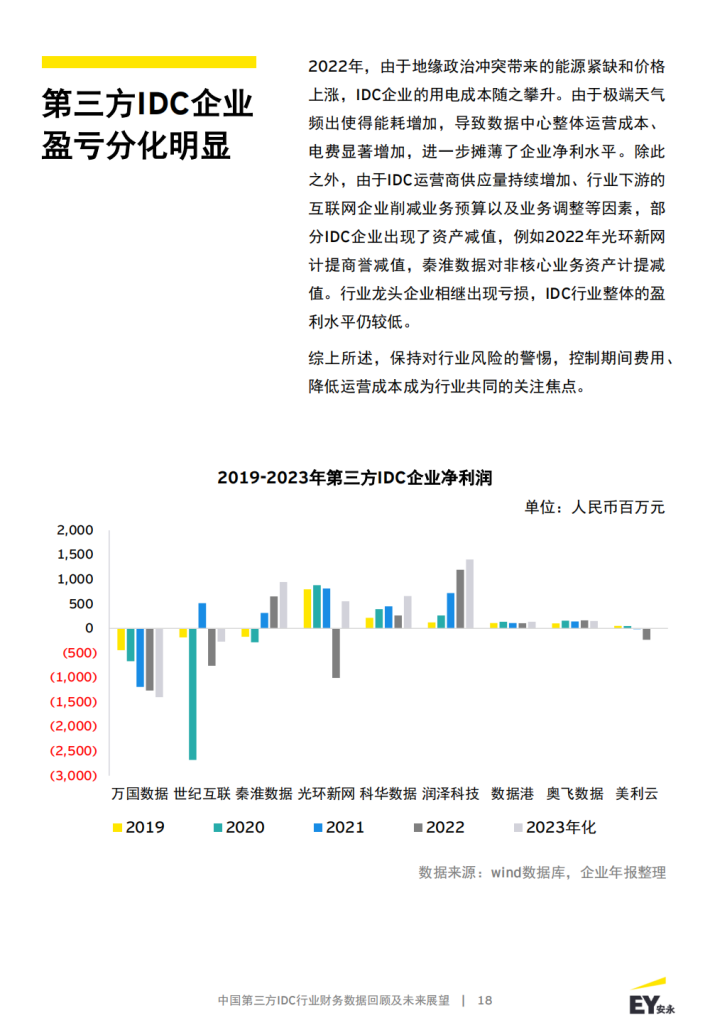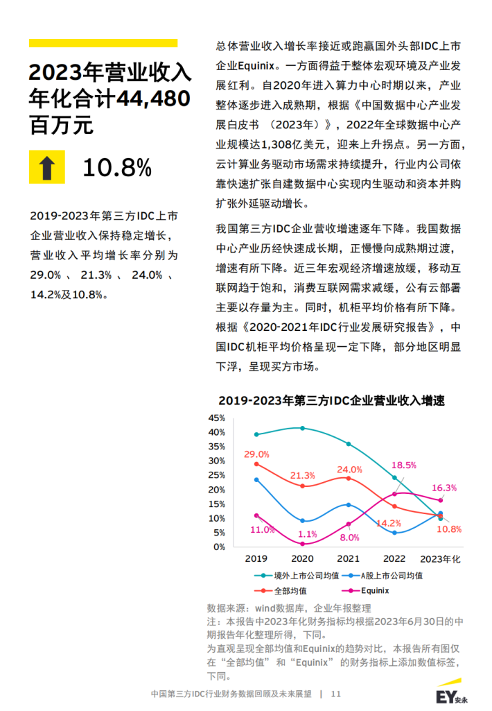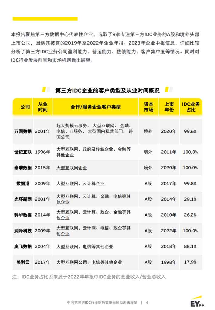 本报告聚焦第三方数据中心代表性企业,选取了9家专注第三方IDC业务的A股和境外头部上市公司,围绕其披露的2019年至2022年企业年报、2023年企业中报信息,详细比较分析了第三方IDC业务公司盈利能力、营运能力、偿债能力、客户集中度等情况。同时对IDC行业发展前景和市场机遇做出展望。