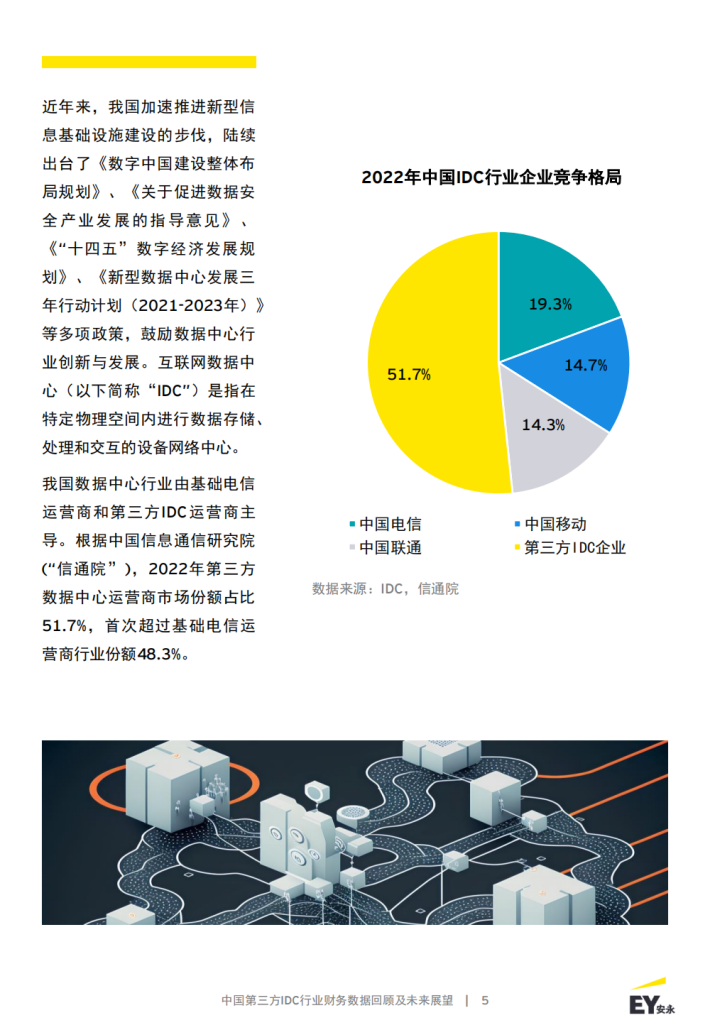 近年来,我国加速推进新型信息基础设施建设的步伐,陆续出台了《数字中国建设整体布局规划》、 《关于促进数据安全产业发展的指导意见》、《“十四五”数字经济发展规划》、 《新型数据中心发展三年行动计划(2021-2023年)》等多项政策,鼓励数据中心行业创新与发展。互联网数据中心(以下简称“IDC”)是指在特定物理空间内进行数据存储、处理和交互的设备网络中心。我国数据中心行业由基础电信运营商和第三方IDC运营商主导。根据中国信息通信研究院(“信通院”),2022年第三方数据中心运营商市场份额占比51.7%,首次超过基础电信运营商行业份额48.3%。