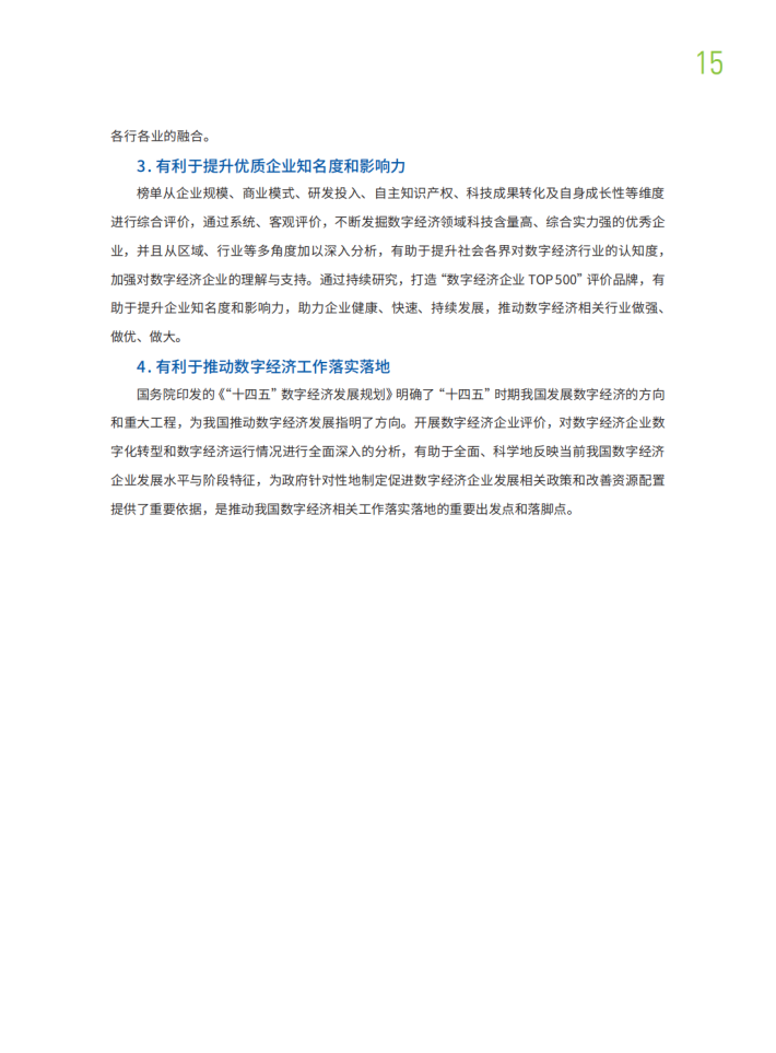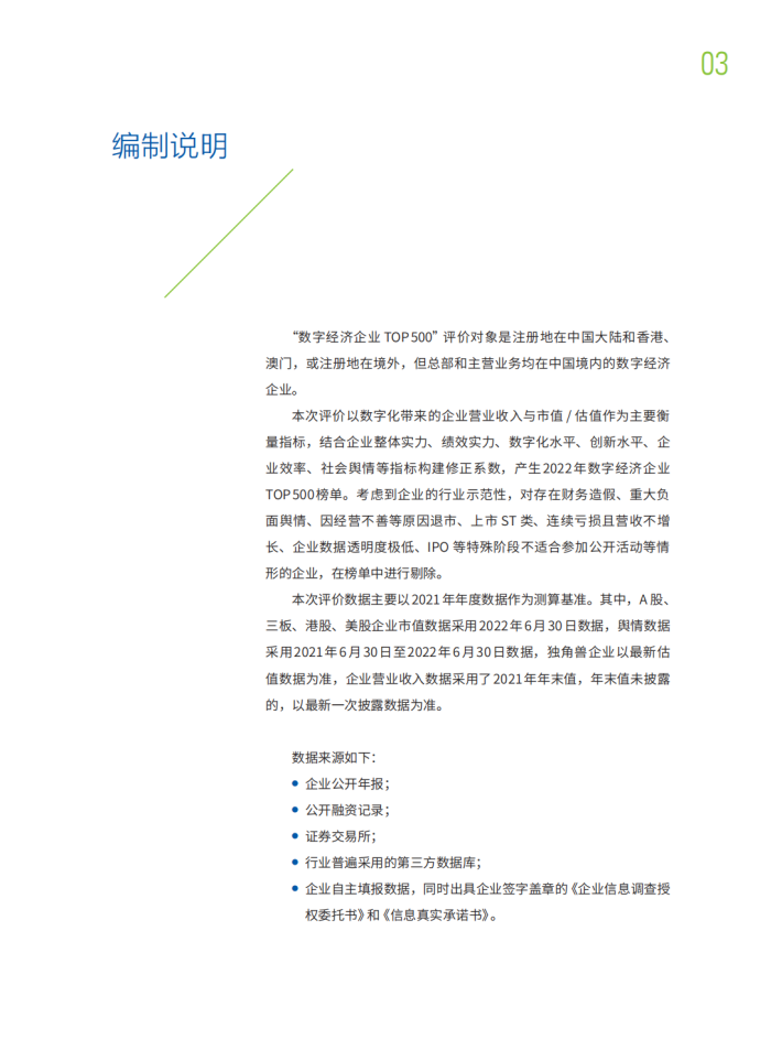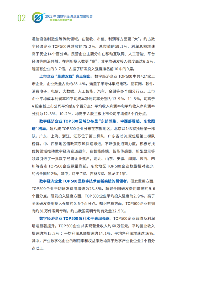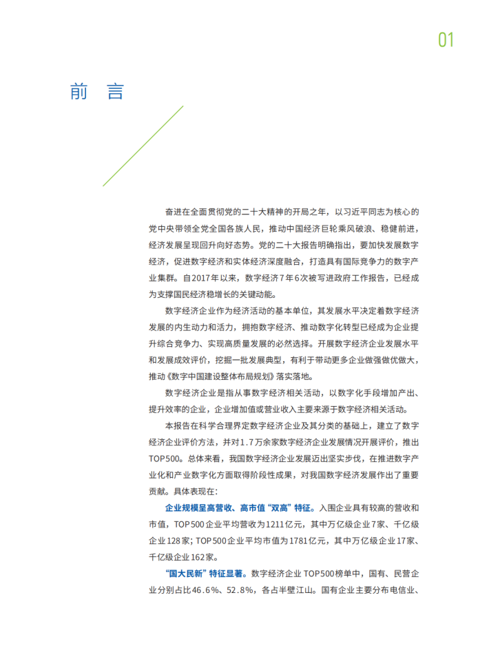 本报告在科学合理界定数字经济企业及其分类的基础上,建立了数字经济企业评价方法,并对1.7万余家数字经济企业发展情况开展评价,推出TOP500。总体来看,我国数字经济企业发展迈出坚实步伐,在推进数字产业化和产业数字化方面取得阶段性成果,对我国数字经济发展作出了重要贡献。