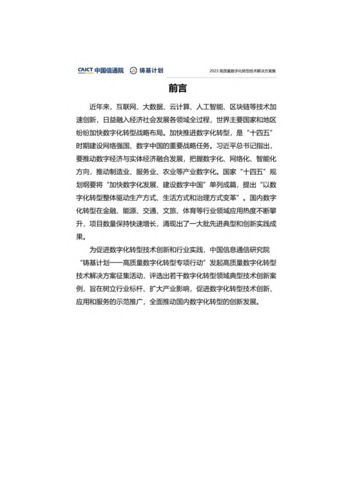 为促进数字化转型技术创新和行业实践,中国信息通信研究院“铸基计划——高质量数字化转型专项行动”发起高质量数字化转型技术解决方案征集活动,评选出若干数字化转型领域典型技术创新案例,旨在树立行业标杆、扩大产业影响,促进数字化转型技术创新、应用和服务的示范推广,全面推动国内数字化转型的创新发展。
