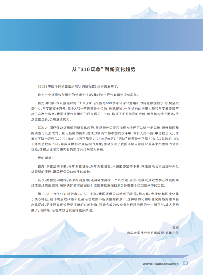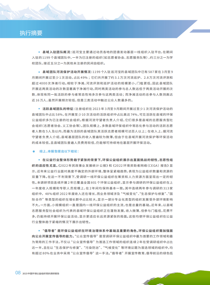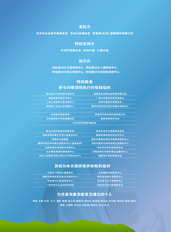 倡导者是环保公益组织在环境治理体系中扮演的基础且重要的角色。根据《中国社会组织气候行动研究报告》,公益组织在包括气候行动在内的环保公益事业中可扮演四种角色——倡导者、监督者/行动者、赋能者,以及创新解决方案提供者。四种角色在结构上呈金字塔状,数量依次递减(四种角色并非互斥)。倡导者开展宣传教育,倡导前沿的绿色低碳理念、模式,从而凝聚社会共识,为环保事业筑起牢固的社会基础,是环保公益事业的“基石”。本次调研印证了这一判断,并显示出环保公益组织作为环保公益事业倡导者的基本盘是稳定的。在气候变化应对等前沿议题上,环保公益组织作为倡导者则有着更大的价值发挥空间。