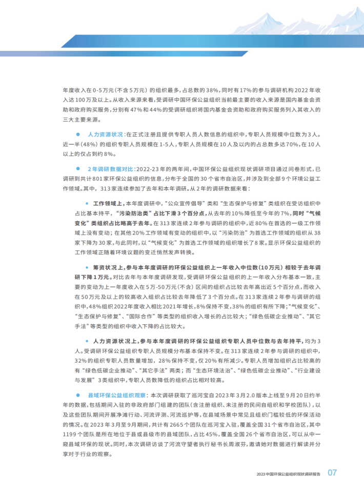 在公益行业资源整体趋于紧缩的背景下,环保公益组织应坚持做好“倡导者”,进一步链接公众,凸显贴近大众和社区的优势。在本年度调研中,有近30%的受调研组织将个人捐赠列为前三位的收入来源,超过10%的组织更是将其列为首要收入来源,有效的公众传播可有力助推个人捐赠的募集。综上,环保公益组织若要争取其在环境治理体系中更为稳固的一席之地,提高面向公众的宣传倡导能力至关重要。