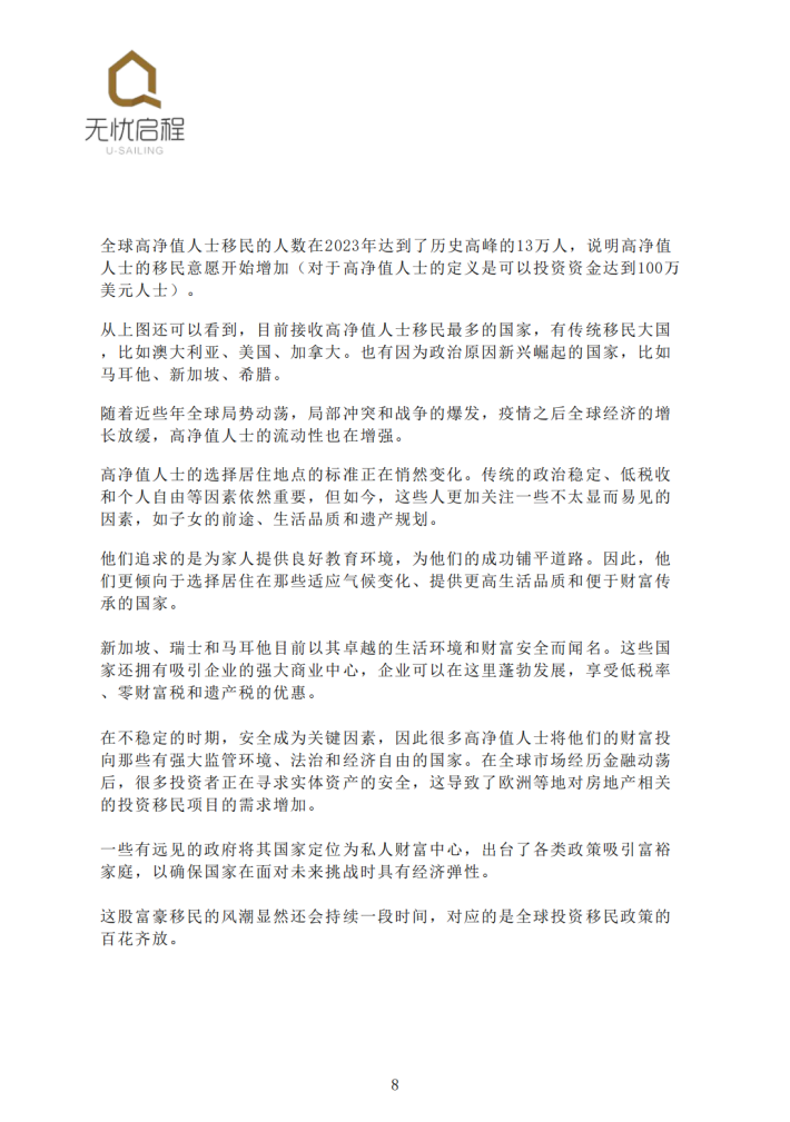 在不稳定的时期,安全成为关键因素,因此很多高净值人士将他们的财富投向那些有强大监管环境、法治和经济自由的国家。在全球市场经历金融动荡后,很多投资者正在寻求实体资产的安全,这导致了欧洲等地对房地产相关的投资移民项目的需求增加。