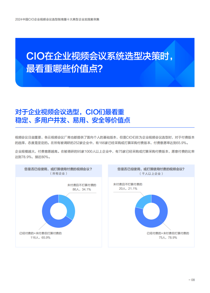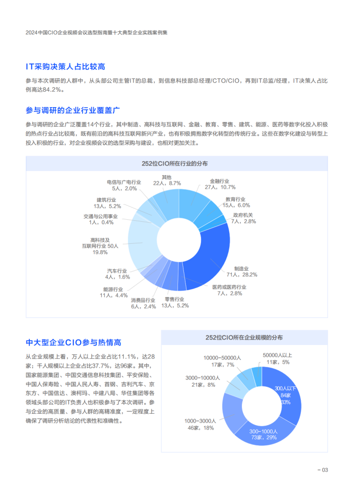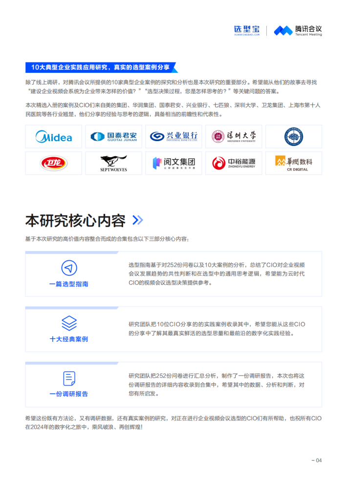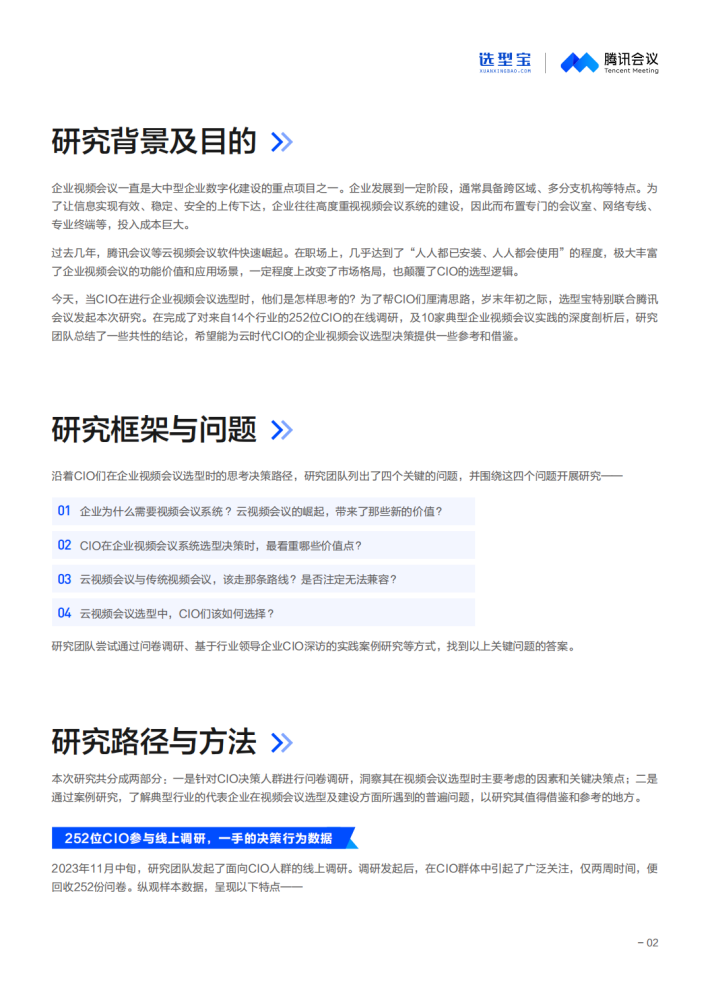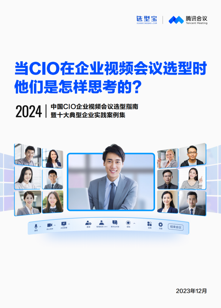 今天,当CIO在进行企业视频会议选型时,他们是怎样思考的?为了帮CIO们厘清思路,岁末年初之际,选型宝特别联合腾讯会议发起本次研究。在完成了对来自14个行业的252位CIO的在线调研,及10家典型企业视频会议实践的深度剖析后,研究团队总结了一些共性的结论,希望能为云时代CIO的企业视频会议选型决策提供一些参考和借鉴。