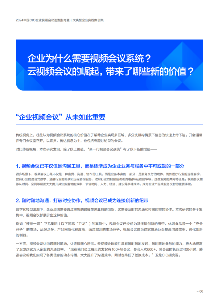 过去几年,腾讯会议等云视频会议软件快速崛起。在职场上,几乎达到了“人人都已安装、人人都会使用”的程度,极大丰富了企业视频会议的功能价值和应用场景,一定程度上改变了市场格局,也颠覆了CIO的选型逻辑。