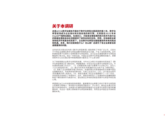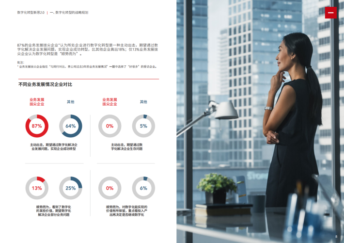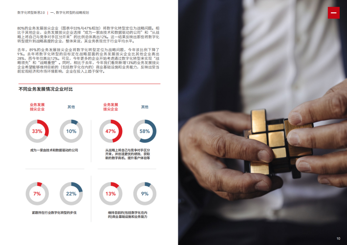 23%的受访企业认为企业做数字化转型是“顺势而为”,他们看到了数字化的某些价值,期望数字化解决企业部分业务问题;也有5%的受访者在启动数字化转型时相对比较谨慎和保守,他们对于对数字化能实现的价值有所保留,重点看投入产出再决定是否继续数字化。