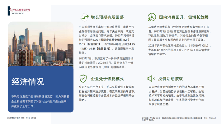 中国的顶线增长率低于新冠疫情前,房地产行业存在着潜在的问题、青年失业率高、政府支出减少、全球出口需求放缓。2023年对GDP增长的预测为5.0%(国际货币基金组织IMF)/5.1%(世界银行),而对2024年的预测为4.2%(IMF)/4.4%(世界银行)。通货膨胀率一直很低。