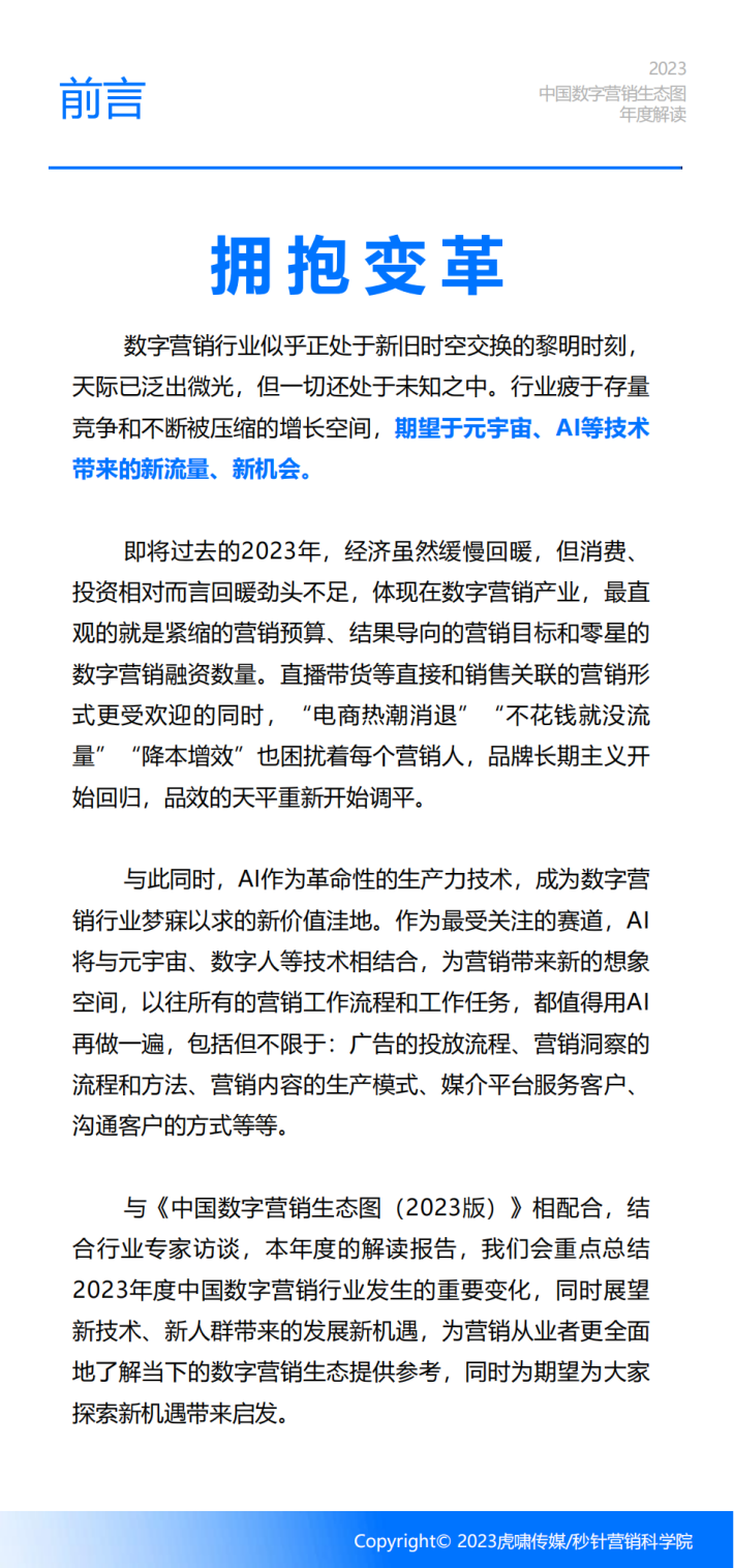 与《中国数字营销生态图(2023版)》相配合,结合行业专家访谈,本年度的解读报告,我们会重点总结2023年度中国数字营销行业发生的重要变化,同时展望新技术、新人群带来的发展新机遇,为营销从业者更全面地了解当下的数字营销生态提供参考,同时为期望为大家探索新机遇带来启发。