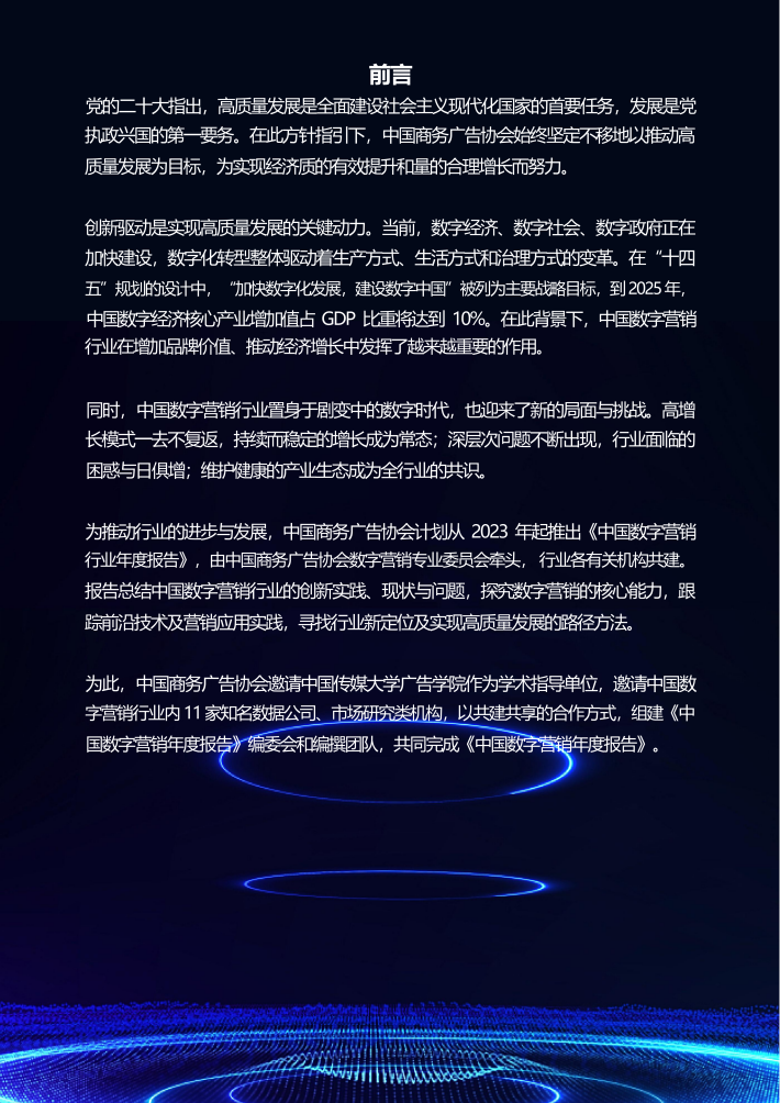 为此,中国商务广告协会邀请中国传媒大学广告学院作为学术指导单位,邀请中国数字营销行业内11家知名数据公司、市场研究类机构,以共建共享的合作方式,组建《中国数字营销年度报告》编委会和编撰团队,共同完成《中国数字营销年度报告》。