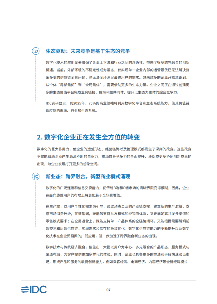 在政策、技术、创新和生态的多重驱动作用下,数字化企业的运营形态、经营链路以及管理模式都在发生深刻的变化。数字化的广泛连接和信息交换能力,使传统B端和C端市场的清晰界限变得模糊,企业在面向终端用户的布局上,将更加趋向于跨界融合下的全场景覆盖,从而使商业模式不断获得创新。同时,供应链和市场端的管控难度在不断提升,故企业端到端的全链路贯通能力变得更加重要,全链路协同水平将深刻影响企业未来的发展空间。此外,数字化时代的企业管理理念也需要持续升级,从以产品为中心的单一价值导向,转为以客户为中心的价值重构,进而寻求多方共赢。