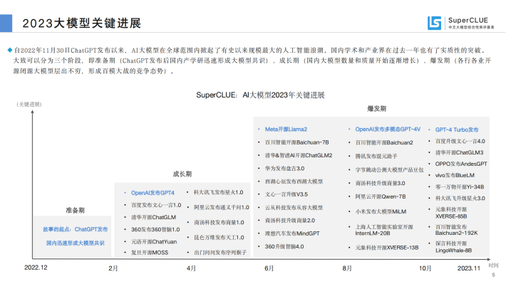 自2022年11月30日ChatGPT发布以来,AI大模型在全球范围内掀起了有史以来规模最大的人工智能浪潮。国内学术和产业界在过去一年也有了实质性的突破。大致可以分为三个阶段,即准备期(ChatGPT发布后国内产学研迅速形成大模型共识)、成长期(国内大模型数量和质量开始逐渐增长)、爆发期(各行各业开源闭源大模型层出不穷,形成百模大战的竞争态势)。