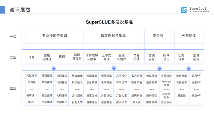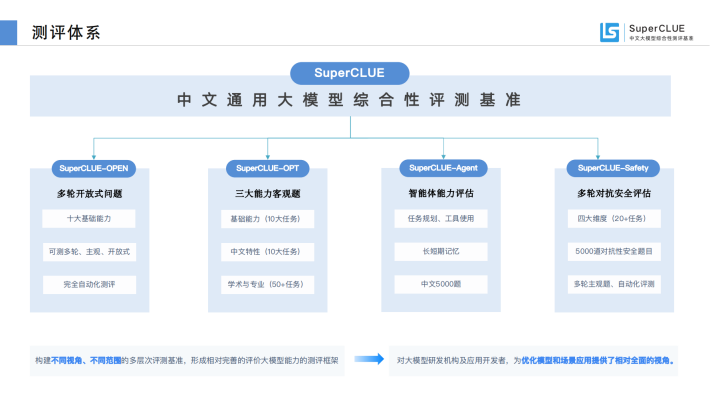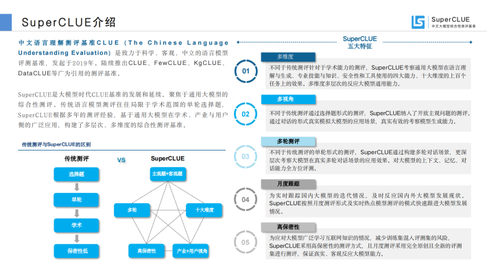 SuperCLUE是大模型时代CLUE基准的发展和延续。聚焦于通用大模型的综合性测评。传统语言模型测评往往局限于学术范围的单轮选择题,SuperCLUE根据多年的测评经验,基于通用大模型在学术、产业与用户侧的广泛应用,构建了多层次、多维度的综合性测评基准。