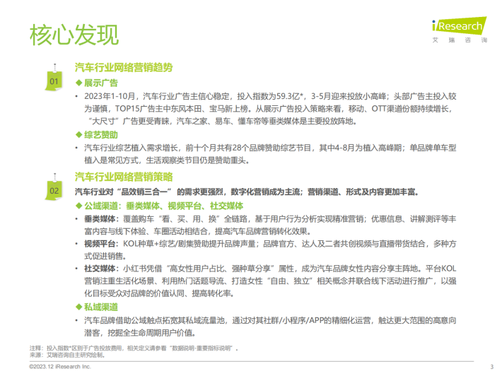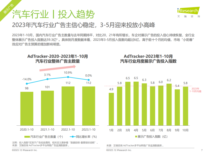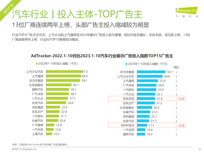 2023年1-10月,汽车行业广告主信心稳定,投入指数为59.3亿*,3-5月迎来投放小高峰;头部广告主投入较为谨慎,TOP15广告主中东风本田、宝马新上榜。从展示广告投入策略来看,移动、OTT渠道份额持续增长,“大尺寸”广告更受青睐,汽车之家、易车、懂车帝等垂类媒体是主要投放阵地。