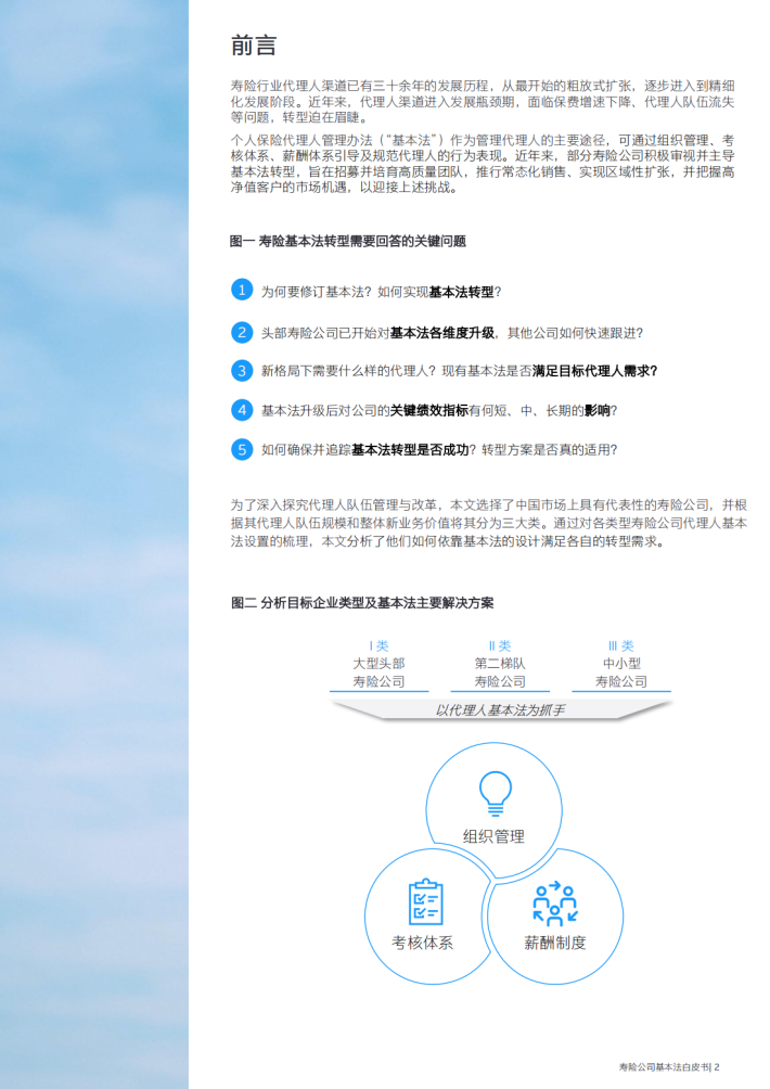 个人保险代理人管理办法(“基本法”)作为管理代理人的主要途径,可通过组织管理、考核体系、薪酬体系引导及规范代理人的行为表现。近年来,部分寿险公司积极审视并主导基本法转型,旨在招募并培育高质量团队,推行常态化销售、实现区域性扩张,并把握高净值客户的市场机遇,以迎接上述挑战。