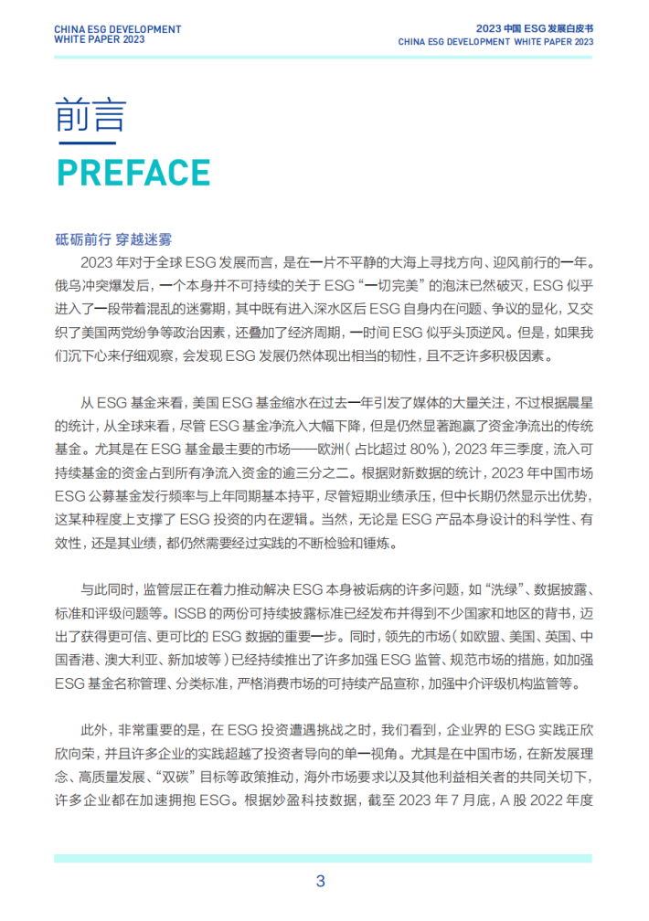2023年对于全球ESG发展而言,是在一片不平静的大海上寻找方向、迎风前行的一年。俄乌冲突爆发后,一个本身并不可持续的关于ESG“一切完美”的泡沫已然破灭,ESG似乎进入了一段带着混乱的迷雾期,其中既有进入深水区后ESG自身内在问题、争议的显化,又交织了美国两党纷争等政治因素,还叠加了经济周期,一时间ESG似乎头顶逆风。但是,如果我们沉下心来仔细观察,会发现ESG发展仍然体现出相当的韧性,且不乏许多积极因素。