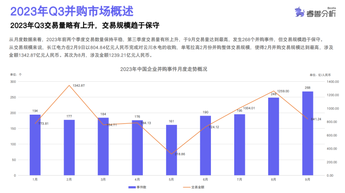 从月度数据来看,2023年前两个季度交易数量保持平稳,第三季度交易量有所上升,于9月交易量达到最高,发生268个并购事件,但交易规模趋于保守。从交易规模来说,长江电力在2月9日以804.84亿元人民币完成对云川水电的收购,单笔拉高2月份并购整体交易规模,使得2月并购交易规模达到最高,涉及