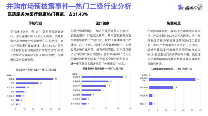 从预披露的并购事件数量来看,在2023年Q3预披露并购事件共474个,涉及交易金额1958.66亿元人民币。其中,传统行业、医疗健康和智能制造等领域的