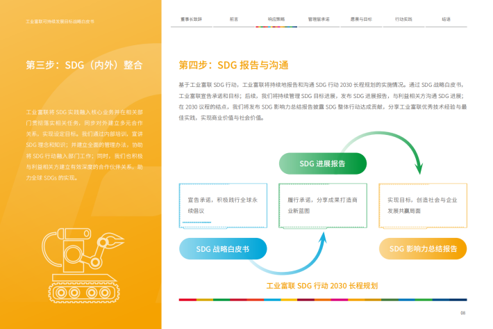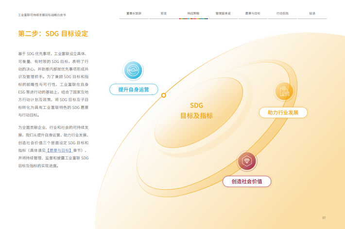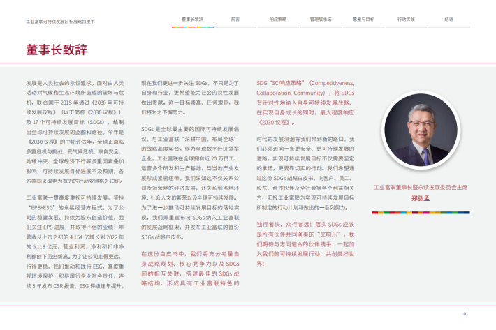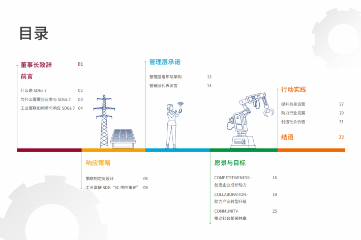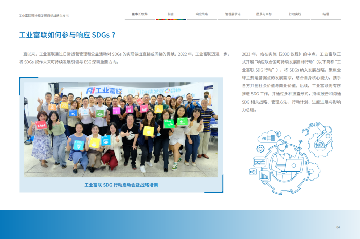 在工业富联(亦称“Fii”)的主要运营地,中国、越南、墨西哥等国家,SDGs已被纳入国家行动计划或总体战略中,以应对运营地一系列可持续发展问题与挑战。作为智能制造的龙头企业,工业富联本着“深耕中国,布局全球”的理念,以SDGs为抓手投入资源,对当地作出有效的响应和支持,共同解决人类发展问题。SDGs不仅是全球合作伙伴的共同语言,更是企业创造的潜力所在。SDGs不仅能助力工业富联解决社会问题,还能创造新商业机会、成长动力与正面的财务绩效,也期望能为整个行业的创新转型发展开拓新的蓝图。
