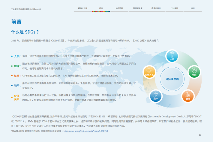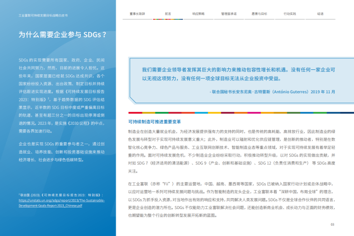 制造业在创造大量就业机会,为经济发展提供强有力的支持的同时,也是传统的高耗能、高排放行业,因此制造业的绿色发展与转型对于实现可持续发展意义重大;此外,制造业可以辐射和优化供应链管理,是创新的推动者,特别是在数智化核心竞争力、绿色产品与服务、工业互联网创新技术、智能制造业态等重点领域,对于实现可持续发展有着举足轻重的作用。面对可持续发展危机,不少制造业企业纷纷采取行动,积极推动转型升级,以对SDGs的实现做出贡献,并对如SDG7(经济适用的清洁能源)、SDG9(产业、创新和基础设施)、SDG12(负责任消费和生产)等SDGs高度关注。