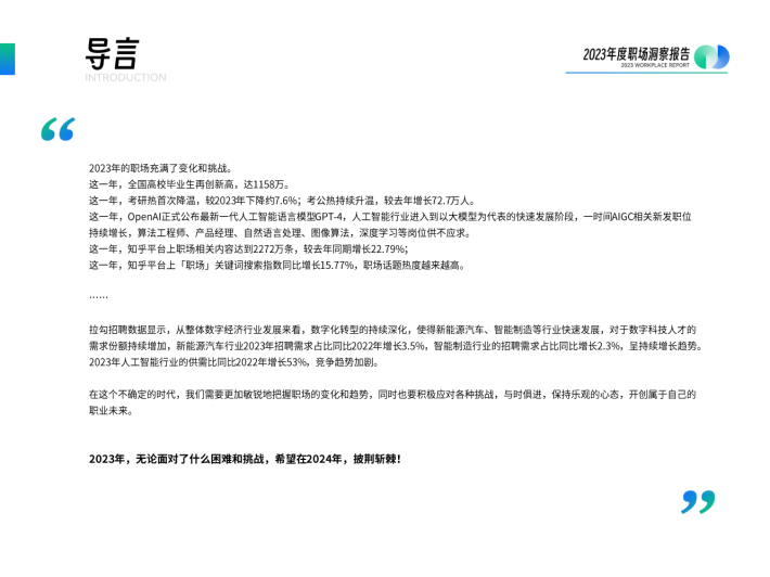这一年,OpenAl正式公布最新一代人工智能语言模型GPT-4,人工智能行业进入到以大模型为代表的快速发展阶段,一时间AIGC相关新发职位持续增长,算法工程师、产品经理、自然语言处理、图像算法,深度学习等岗位供不应求。这一年,知乎平台上职场相关内容达到2272万条,较去年同期增长22.79%;这一年,知乎平台上「职场」关键词搜索指数同比增长15.77%,职场话题热度越来越高。
