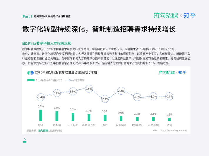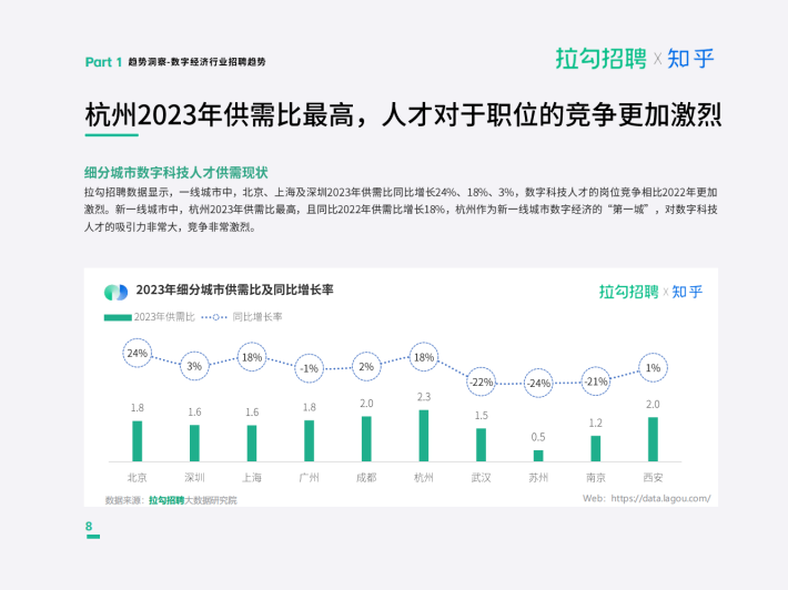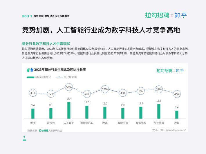 拉勾招聘数据显示,从整体数字经济行业发展来看,数字化转型的持续深化,使得新能源汽车、智能制造等行业快速发展,对于数字科技人才的需求份额持续增加,新能源汽车行业2023年招聘需求占比同比2022年增长3.5%,智能制造行业的招聘需求占比同比增长2.3%,呈持续增长趋势。2023年人工智能行业的供需比同比2022年增长53%,竞争趋势加剧。