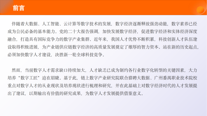 然而,当前数字人才需求缺口持续加大,人才缺乏已成为制约各行业数字化转型的关键因素,大力培养“数字工匠”迫在眉睫。基于此,链上数字产业研究院联合猎聘大数据、广州番禺职业技术院校重点对数字人才的从业现状及培养现状进行梳理和研究,并在此基础上对数字经济时代的人才发展提出了建议,以期输出有价值的研究成果,为数字人才发展提供借鉴意义。
