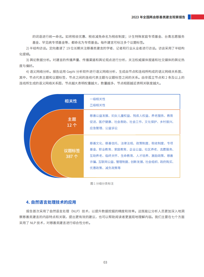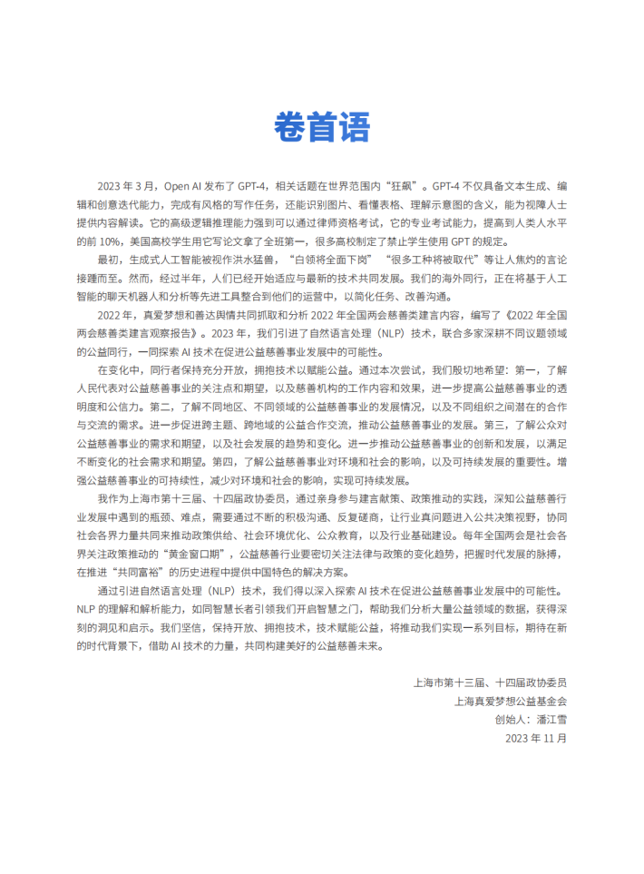 2022年,真爱梦想和善达舆情共同抓取和分析2022年全国两会慈善类建言内容,编写了《2022年全国两会慈善类建言观察报告》。2023年,我们引进了自然语言处理(NLP)技术,联合多家深耕不同议题领域的公益同行,一同探索Al技术在促进公益慈善事业发展中的可能性。