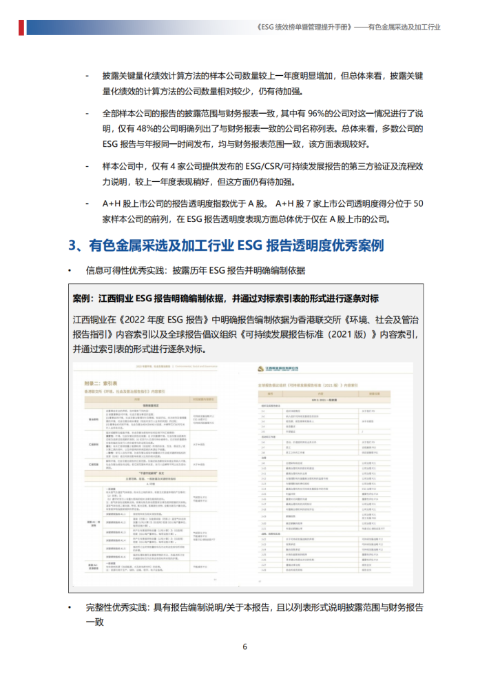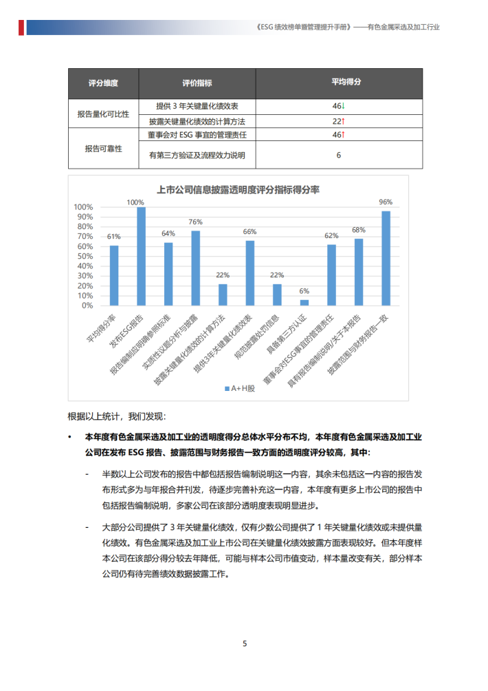 大部分公司提供了3年关键量化绩效,仅有少数公司提供了1年关键量化绩效或未提供量化绩效。有色金属采选及加工业上市公司在关键量化绩效披露方面表现较好。但本年度样本公司在该部分得分较去年降低,可能与样本公司市值变动,样本量改变有关,部分样本公司仍有待完善绩效数据披露工作。