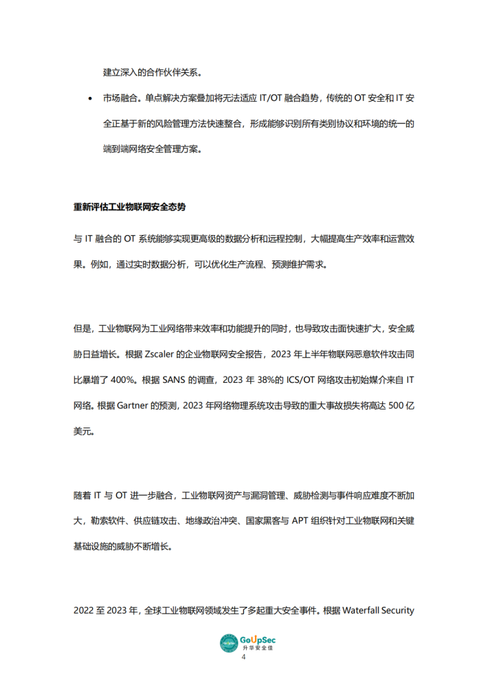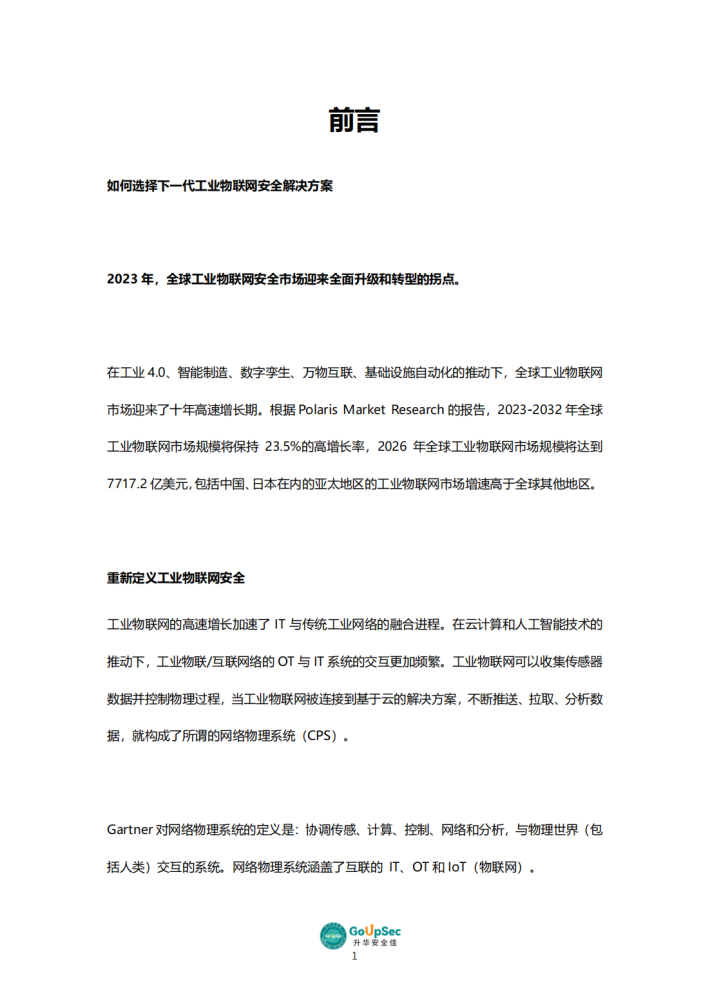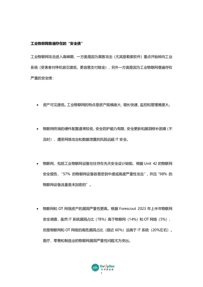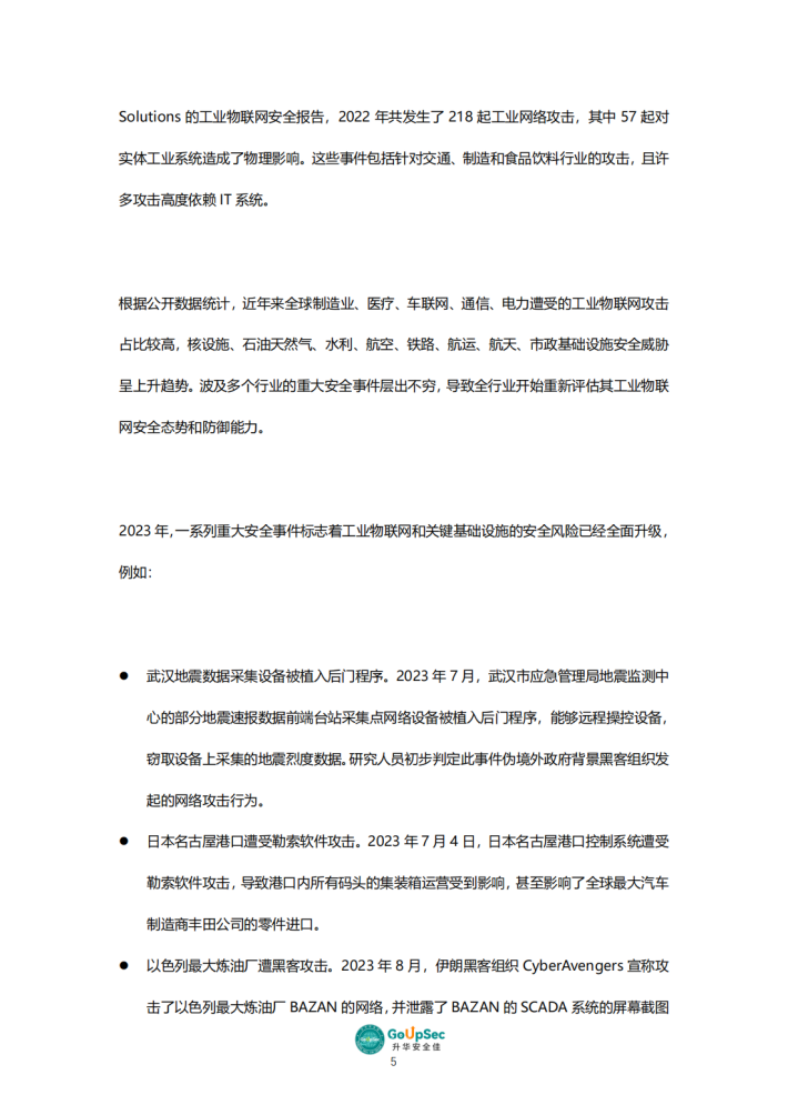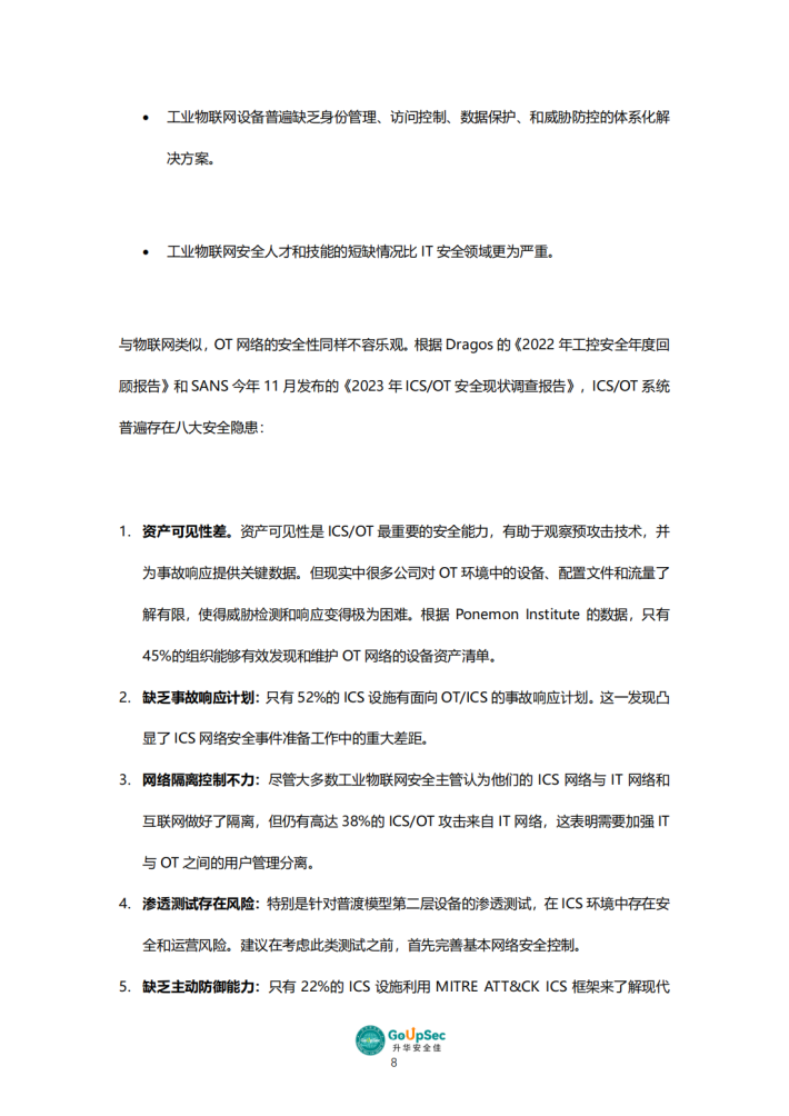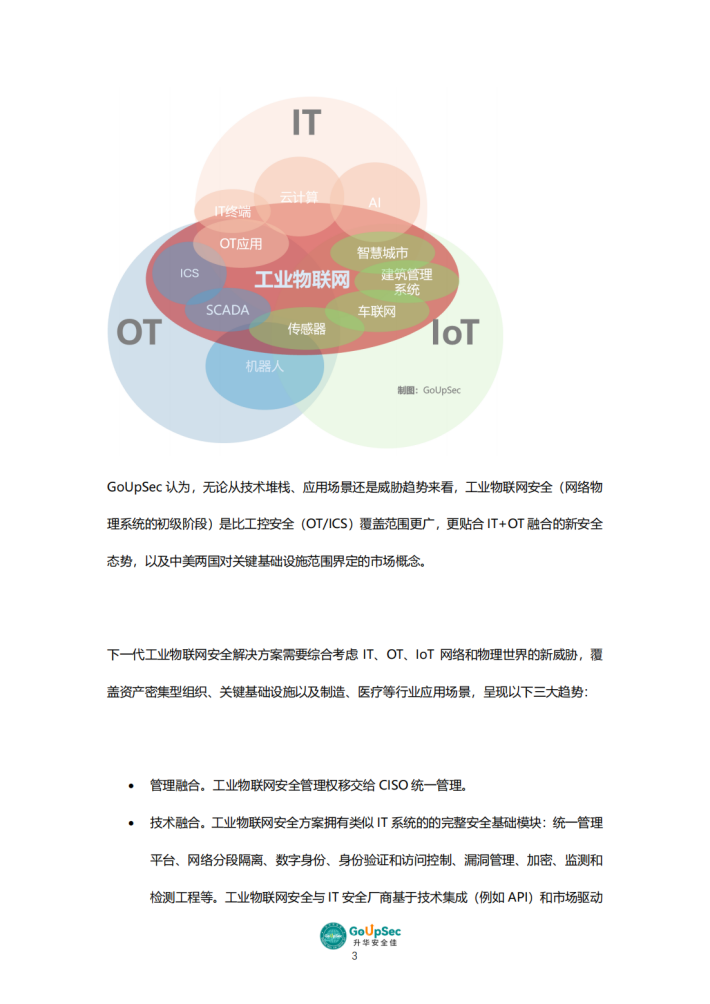 本报告所指的“工业物联网”对应Gartner定义的工控系统发展的第三阶段(上图),是涵盖物联网(云、管、边、端/传感器)、IT/OT融合系统及行业资产的网络物理系统。其中OT涵盖了所有与实体资产操作相关的技术,包括ICS工控系统和非工业控制系统。 (ICS专注于工业流程的控制和自动化,非工业控制系统包括电力线路的自动化控制、水务系统、交通控制系统、视频监控系统、车联网等。)