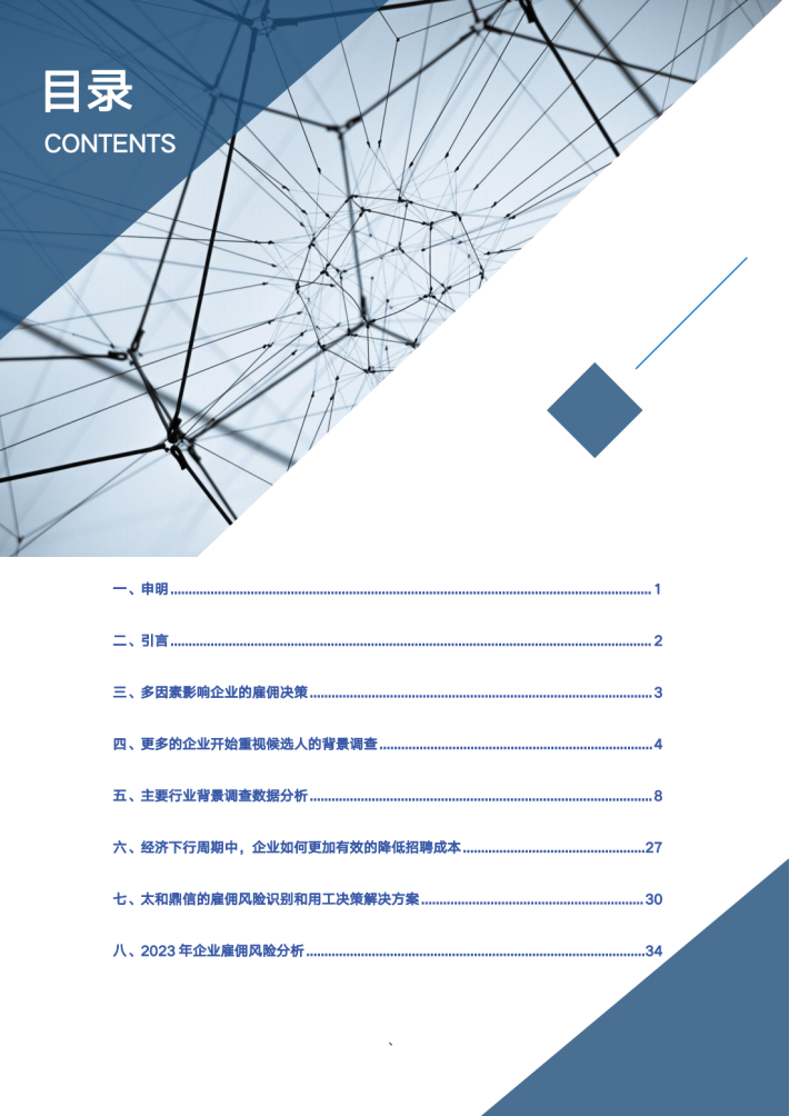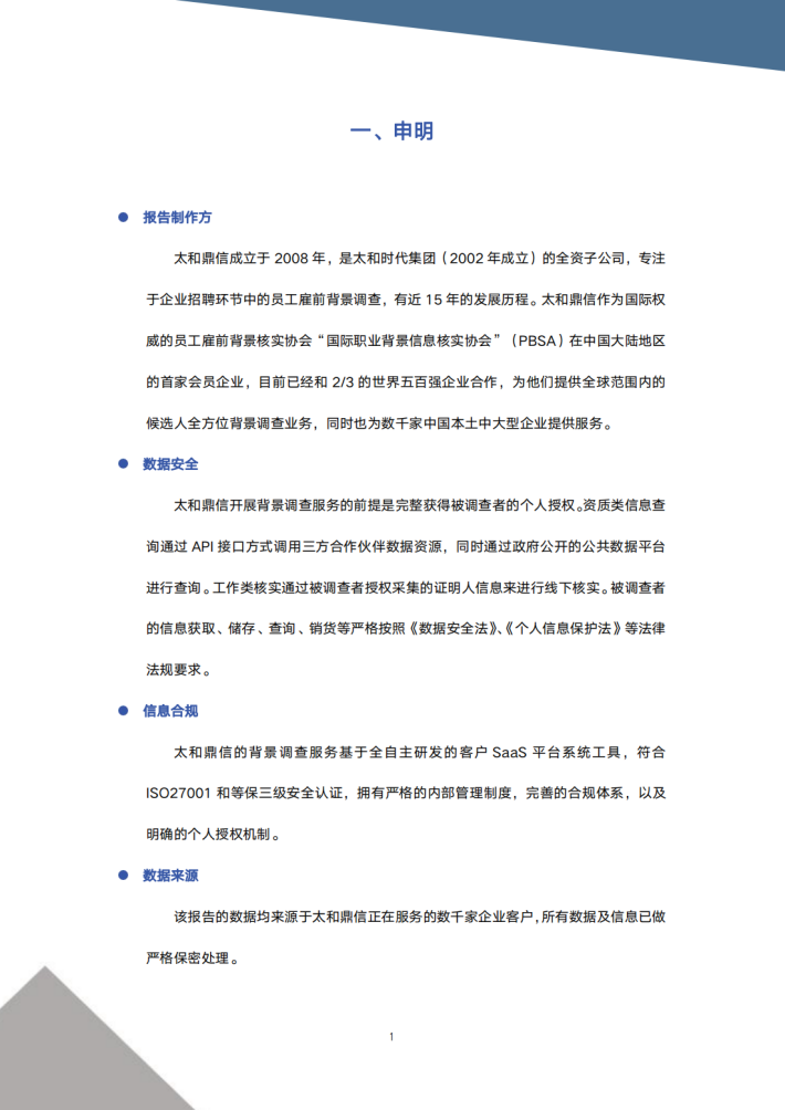 目前全国绝大多数中小企业还没有开展雇前背景调查业务,仅是通过自己的HR进行部分信息调查,调查方式单一,结果也不够准确、全面。太和鼎信基于15年的海量数据积累,也形成了丰富的产品体系和服务标准,对不同行业的数据分析也能清晰展示行业对于人才引进、用人决策的判断趋势,以及如何有效识别风险点、规避雇佣风险。