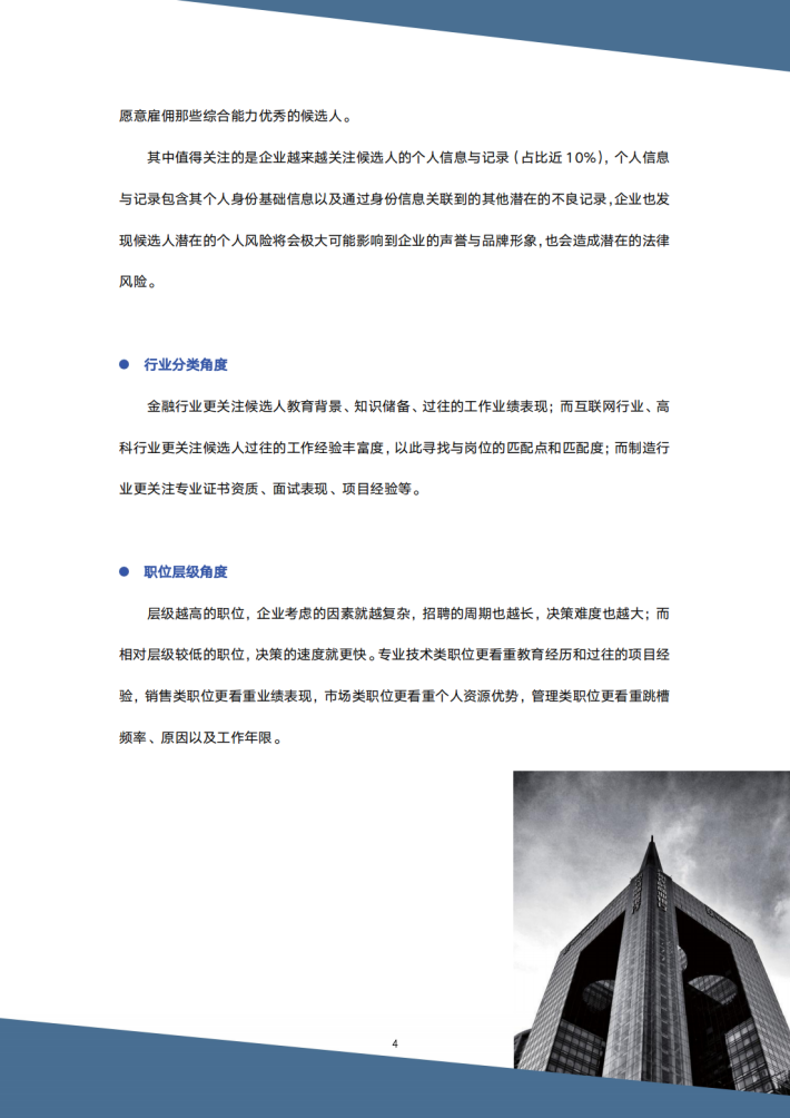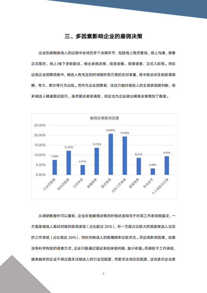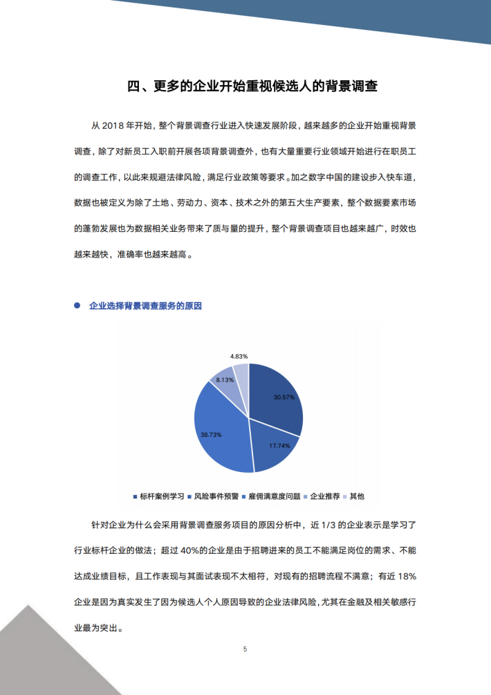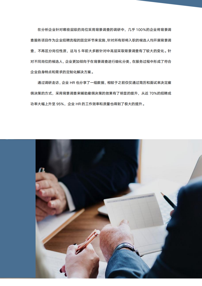 过去近15年的经济周期中,不管是宏观经济指标的跳级式增长,还是企业自身发展所享受的全方位提升,整个行业的招聘数据都是非常可观的,企业也渐渐接受通过增加背景调查这道门槛来快速识别和筛选不合适的候选人。从一开始仅仅识别候选人的资质造假行为,逐渐拓展至对其履历和表现的全方位调查,企业对候选人的画像越来越清晰,对风险点的识别也越来越准确,这也极大降低了企业雇佣风险。