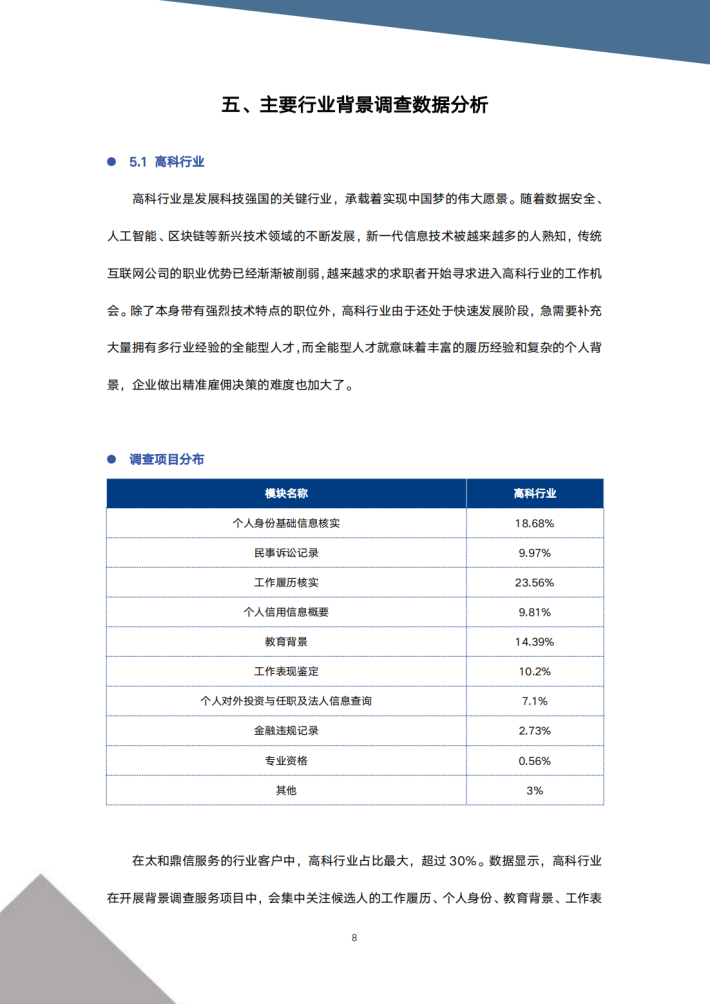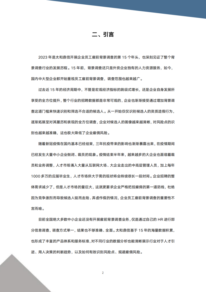 2023年是太和鼎信开展企业员工雇前背景调查的第15个年头,也深刻见证了整个背景调查行业的发展历程。15年前,背景调查还只是外资企业独有的人力资源服务,如今,国内中大型企业都开始重视员工雇前背景调查,调查范围也越来越广。