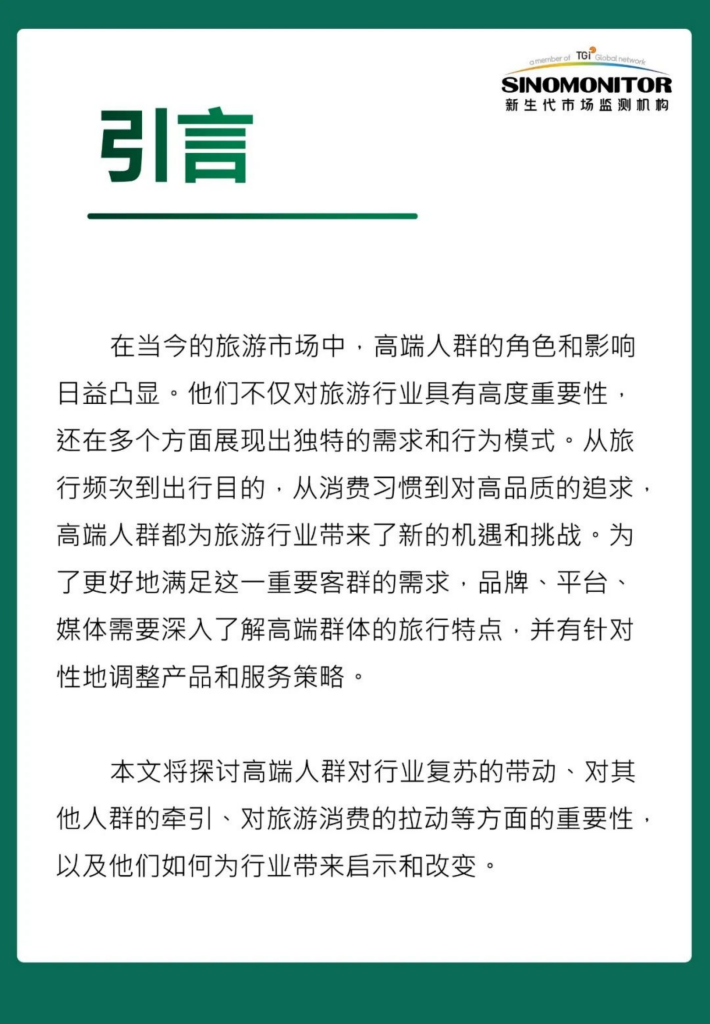 在当今的旅游市场中,高端人群的角色和影响日益凸显。他们不仅对旅游行业具有高度重要性,还在多个方面展现出独特的需求和行为模式。从旅行频次到出行目的,从消费习惯到对高品质的追求,高端人群都为旅游行业带来了新的机遇和挑战。为了更好地满足这一重要客群的需求,品牌、平台、媒体需要深入了解高端群体的旅行特点,并有针对性地调整产品和服务策略。