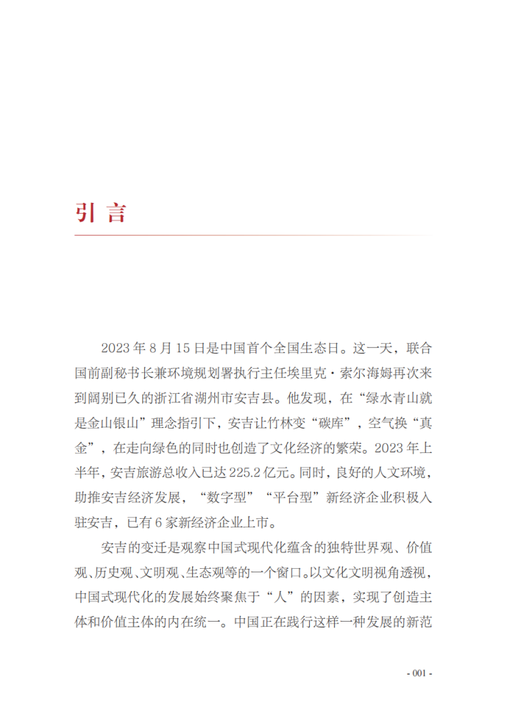 2023年8月15日是中国首个全国生态日。这一天,联合国前副秘书长兼环境规划署执行主任埃里克·索尔海姆再次来到阔别已久的浙江省湖州市安吉县。他发现,在“绿水青山就是金山银山”理念指引下,安吉让竹林变“碳库”,空气换“真金”,在走向绿色的同时也创造了文化经济的繁荣。2023年上半年,安吉旅游总收入已达225.2亿元。同时,良好的人文环境,助推安吉经济发展, “数字型” “平台型”新经济企业积极入驻安吉,已有6家新经济企业上市。