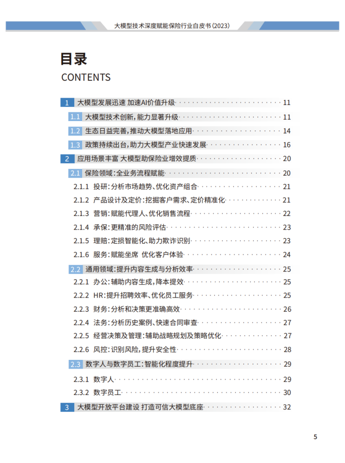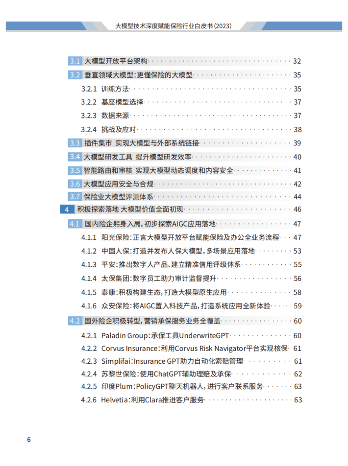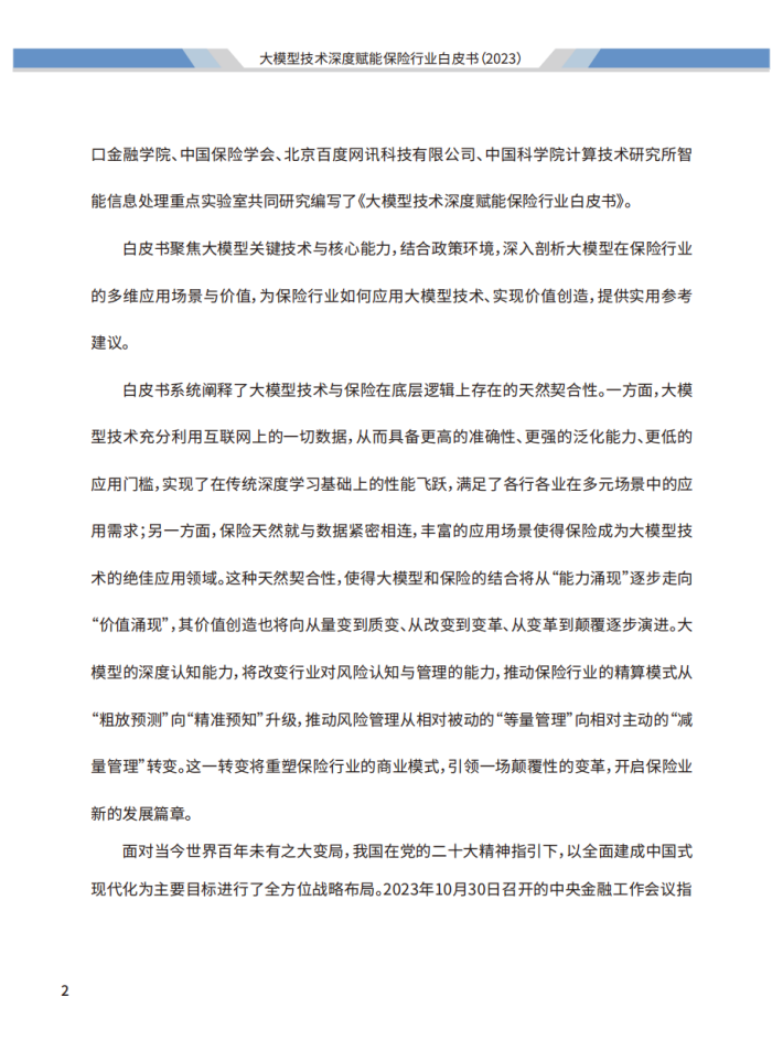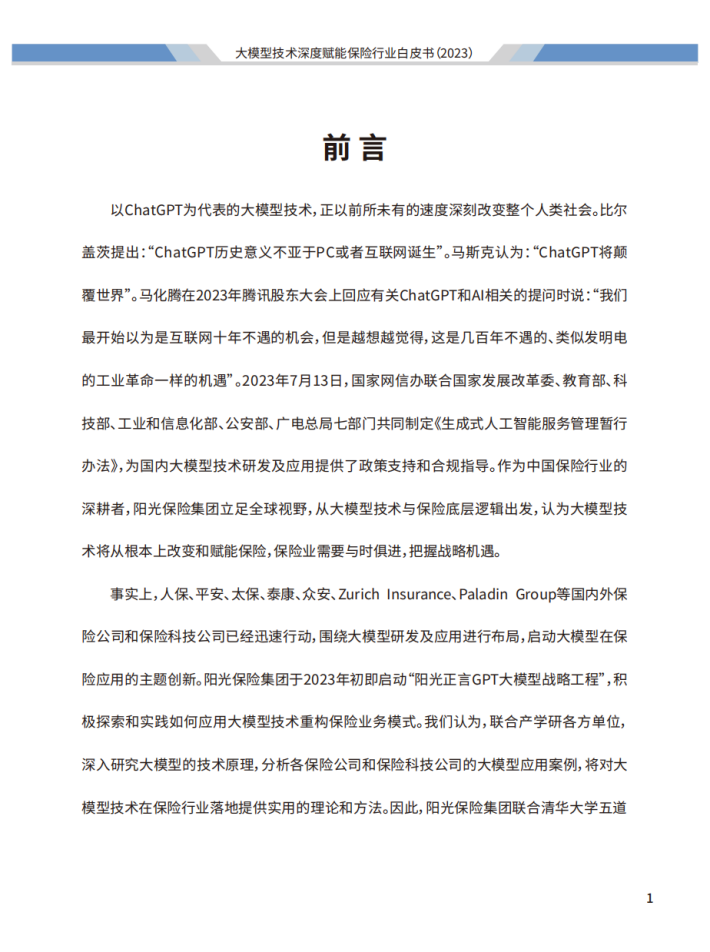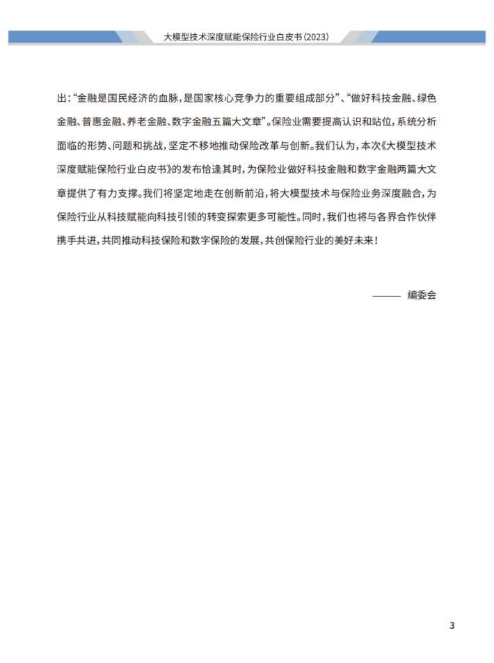 面对当今世界百年未有之大变局,我国在党的二十大精神指引下,以全面建成中国式现代化为主要目标进行了全方位战略布局。2023年10月30日召开的中央金融工作会议指出:“金融是国民经济的血脉,是国家核心竞争力的重要组成部分”、“做好科技金融、绿色金融、普惠金融、养老金融、数字金融五篇大文章”。保险业需要提高认识和站位,系统分析面临的形势、问题和挑战,坚定不移地推动保险改革与创新。我们认为,本次《大模型技术深度赋能保险行业白皮书》的发布恰逢其时,为保险业做好科技金融和数字金融两篇大文章提供了有力支撑。我们将坚定地走在创新前沿,将大模型技术与保险业务深度融合,为保险行业从科技赋能向科技引领的转变探索更多可能性。同时,我们也将与各界合作伙伴携手共进,共同推动科技保险和数字保险的发展,共创保险行业的美好未来!