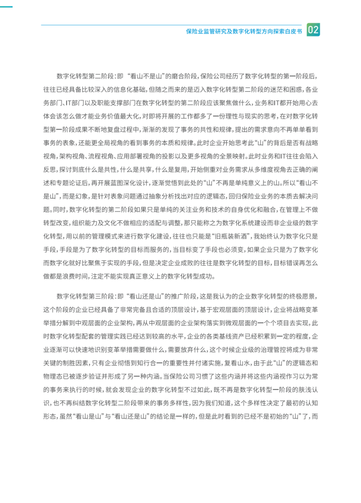 数字化转型第一阶段:即“看山是山”的浪漫阶段,该阶段的保险公司处于信息化建设初期,比较关注需求的单纯,碎片化实现,也就是业务怎么提,IT怎么做,需求都还原成了本原,由于在此阶段的需求往往看到的是表层的一面,形成了最初的简单而直观的“山”。这个时候保险公司通过速赢和核心流程再造等项目使信息化的技术红利得到快速释放,由于该阶段大部分企业的IT部门往往是在唱独角戏,无法从企业全局视角去把控,间接导致搞出来了不少烟囱式的系统,但我们也要充分认识到企业信息化建设的合理性,数字化转型的阶段是漫长而艰难的,初期就是这么现实,满足业务需求是业务和IT必须一起面对的问题,否则企业的数字化转型的路会越走越窄。同时,我们也需要充分意识到华为、建设银行、工商银行等企业在数字化转型领域成功的背后是付出了极大的代价、走了不少弯路,组织架构层面进行了多次的调整和适配,企业的信息化建设是数字化转型的基础,我建议保险公司的数字化转型不要摸着石头过河,需要借鉴银行业、保险业先进经验和理念,但也不要固执地相信数字化转型可以按设定的规则不断运转,对所见到的同业经验就认为是真实的进而产生膜拜,实践证明现实中往往是处处碰壁,从而让企业对数字化转型的落地实施成效产生了一定程度的怀疑。