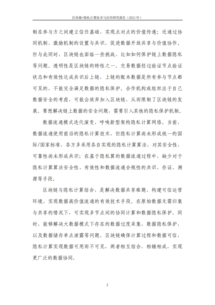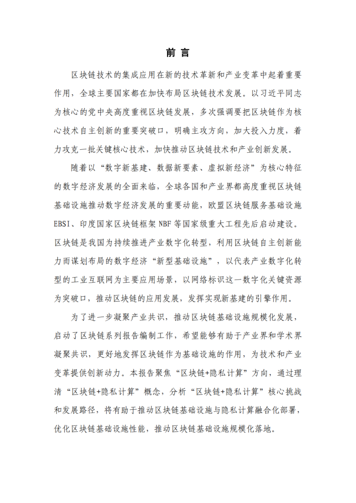 为了进一步凝聚产业共识,推动区块链基础设施规模化发展,启动了区块链系列报告编制工作,希望能够有助于产业界和学术界凝聚共识,更好地发挥区块链作为基础设施的作用,为技术和产业变革提供创新动力。本报告聚焦“区块链+隐私计算”方向,通过理清“区块链+隐私计算”概念,分析“区块链+隐私计算”核心挑战和发展路径,将有助于推动区块链基础设施与隐私计算融合化部署,优化区块链基础设施性能,推动区块链基础设施规模化落地。