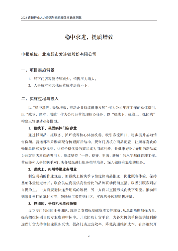 在行业高质量发展的背景下,企业的人力资源和组织管理工作在支持战略发展、提质增效、转型升级等方面承担着更加重要的职能。2023年,中国连锁经营协会开展了“人力资源与组织提效”创新实践案例征集活动。活动旨在更好地洞察行业创新做法,帮助会员单位在人力资源与组织提效方面拓宽思路,增进交流,汲取标杆经验,探寻更好的实践转化。