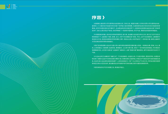 大运会这场万众瞩目的“成都之约”,不仅是成都的,也是四川的,不仅是中国的,更是世界的。本报告系统反映了成都大运会作为绿色低碳办赛践行者、助推低碳生活倡导者、积极应对气候变化参与者的措施及成效,旨在形成大运会绿色低碳实践遗产,让绿色低碳成为一种广泛认同的生产生活方式,同时启发更多国家和地区在举办大型活动时,更加重视生态环境保护和可持续发展,携手共建清洁美丽世界。
