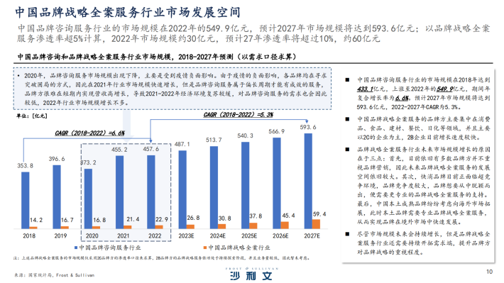 随着中国市场整体变迁,中国品牌战略全案服务行业从早先的“点子公司”发展到现在的集成化品牌战略全案服务商,近年来,中国企业对品牌战略全案服务需求不断增加,行业渗透率及市场规模增长潜力较大。中国品牌咨询服务行业的市场规模由2018的433.1亿元上涨至2022年的549.9亿元,期间年复合增长率为6.6%。预计2027年市场规模将达到593.6亿元,年复合增长率5.3%。尽管市场规模未来会持续增长,但是品牌战略全案服务行业还需要持续开拓需求端,提升品牌方对品牌战略的重视程度。