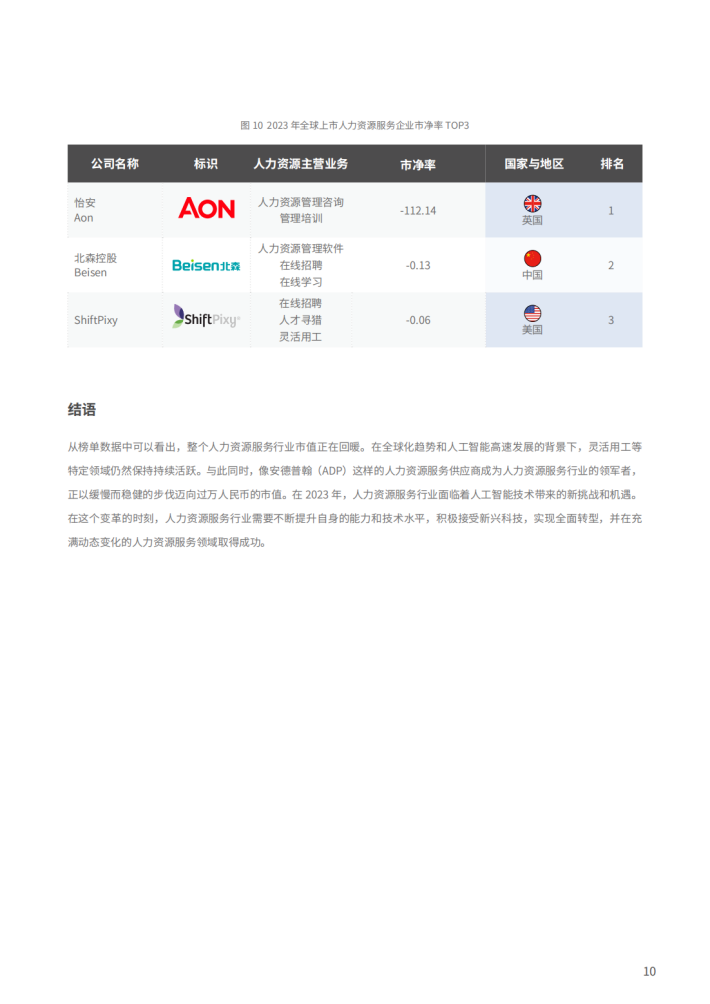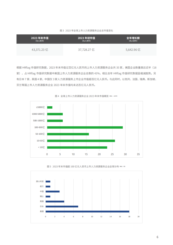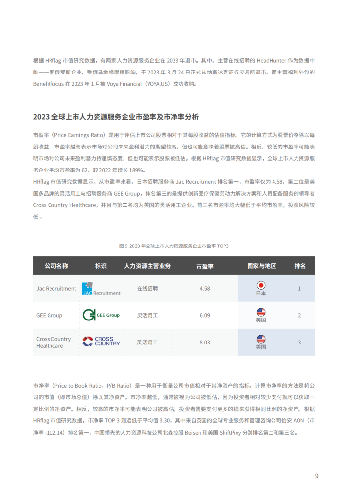 从行业细分领域分布来看,上市企业涉及的领域包含了:灵活用工、招聘流程外包、人才寻猎、在线招聘、管理培训、人力资源管理软件、人力资源管理咨询、人才派遣、薪酬外包、福利外包、零工平台、背景调查和在线学习等。HRflag市值研究数据的前110家企业中,有42家灵活用工企业(25%)、21家招聘流程外包企业(13%)以及20家人才寻猎企业(12%),分列前三位,占据了HRflag市值研究数据中人力资源服务领域企业的半壁江山。可见灵活用工仍是2023年值得关注的领域,由于全球化的趋势和疫情余波的影响,企业竞争激烈且效益下降,企业开始在不同地区寻求灵活用工解决方案,以适应不同国家和地区的劳动力市场特点,企业在追求全球业务扩张时对于跨境灵活用工的需求不断增加,利好灵活用工领域企业发展。
